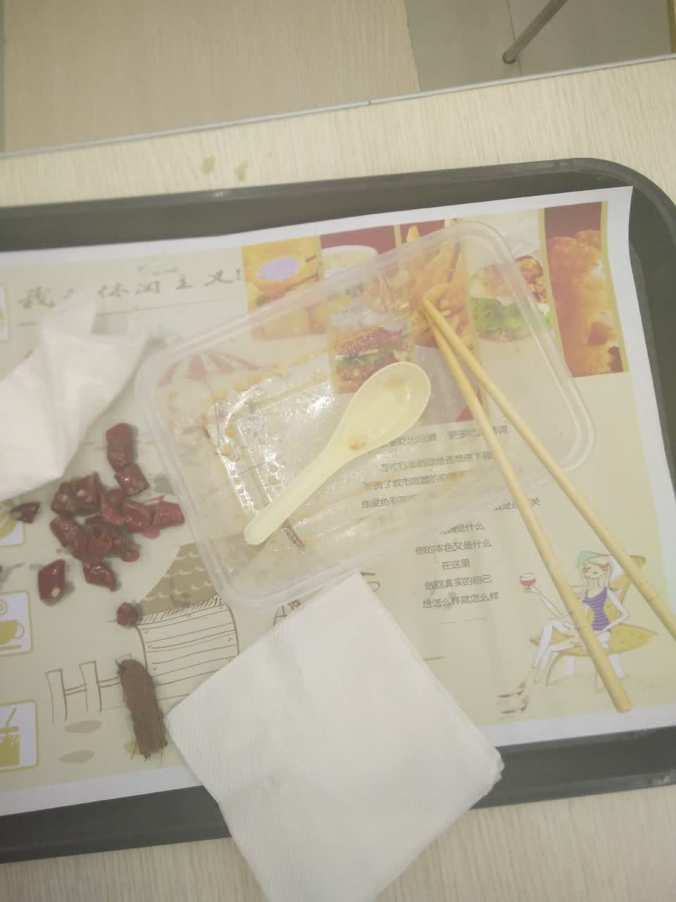 这个饭的营养比较丰富,有鸡肉和青菜.蓮哦,口味不辣,全吃光了