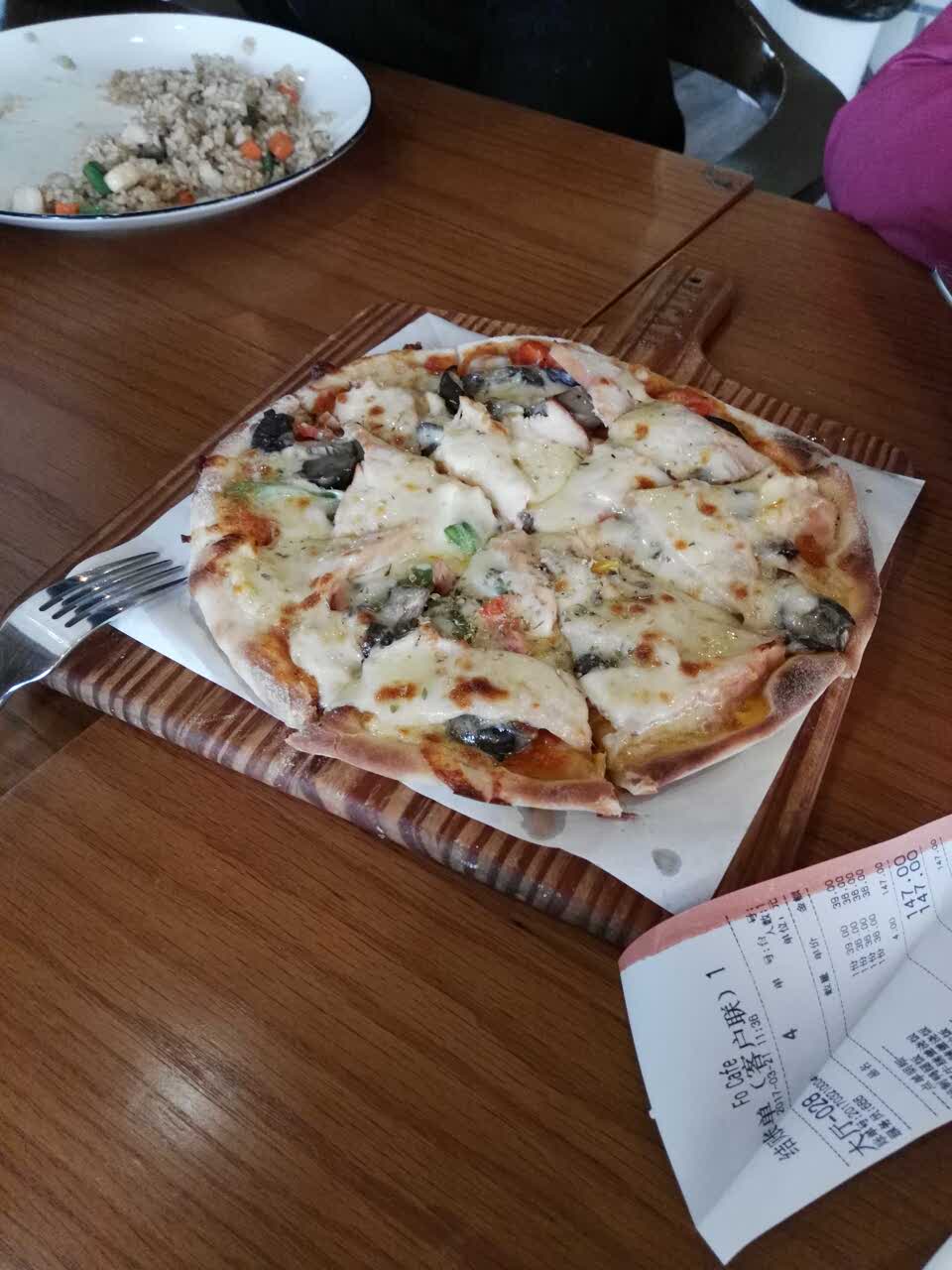 点的牛楠咖哩饭不错,36元一份。 披萨四十元,饼皮较薄,味道一般般点的牛楠咖哩饭不错,36元一份。鸭腿饭是一碗白米饭,一个蛋和一个大烤鸭腿,巡问了服务员有没有配汤,回答是没有,干米饭干鸭腿真心不下饭,39元一份的价格无性价比。 披萨四十元,饼皮较薄,味道一般般。
