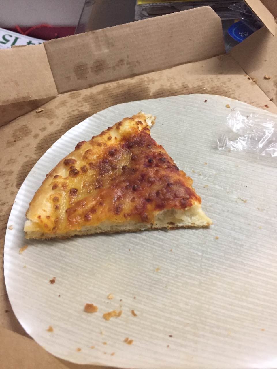 加班晚了在公司楼下买的匹萨,带回家我女儿直叫好吃,是她喜欢的口味。第一次尝试上面不加料的匹萨。