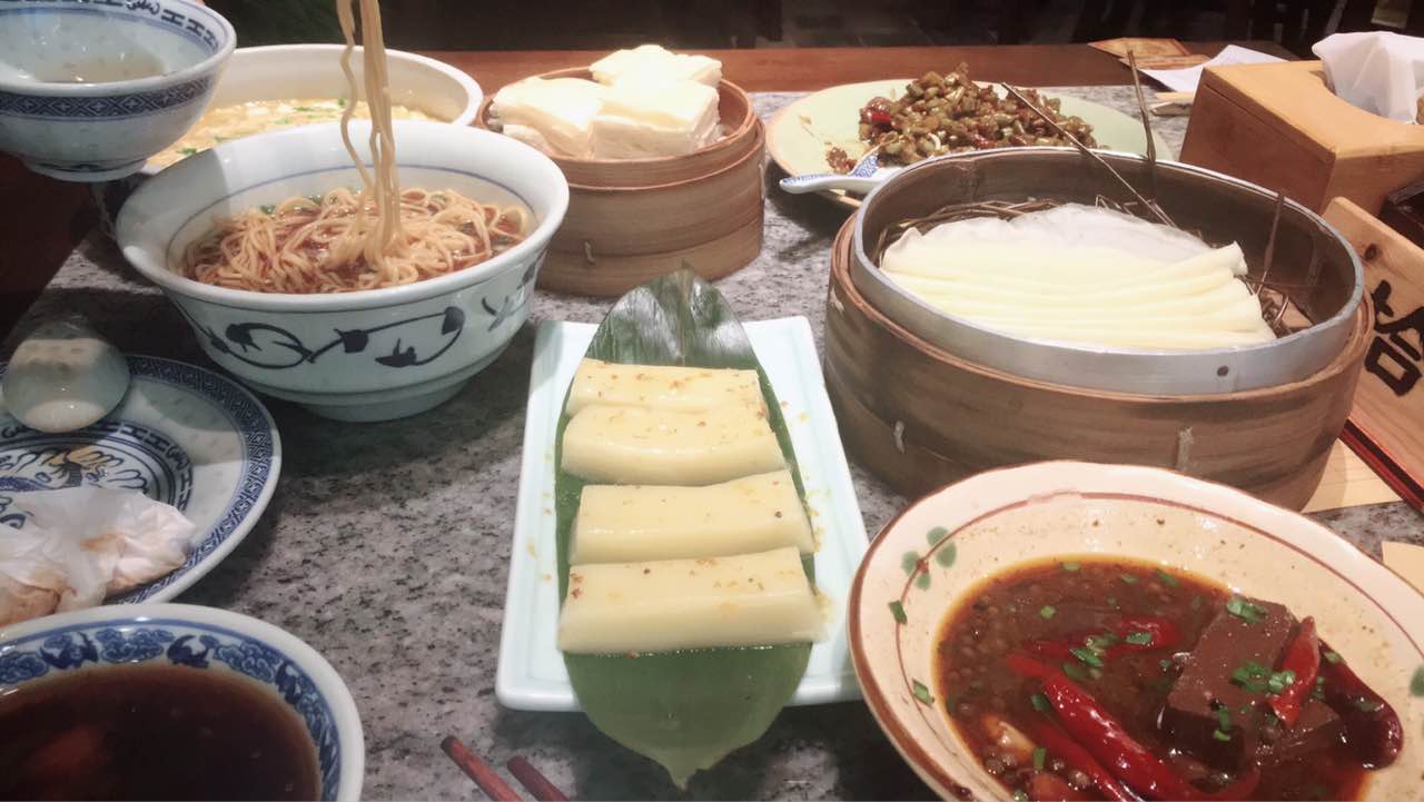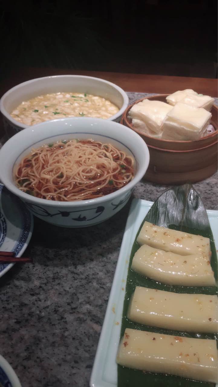 味道不错,我们两个人都吃撑了。才点了3个菜三个点心。那个蒸笼装的油糕一般,不推荐。这个卷饼一样的牛肉粒还不错。桂花糕甜甜的糯糯的,也很好吃,不过有点占肚子。那个空了的碗看到了么,是鸭血,被我们吃完了~很入味,比较适合我们胃口。阳春面汤头可以,但是口味偏淡,面条还是很有嚼劲的。不过我加了鸭血的辣汤。。。总体来说好吃不贵,会在吃。