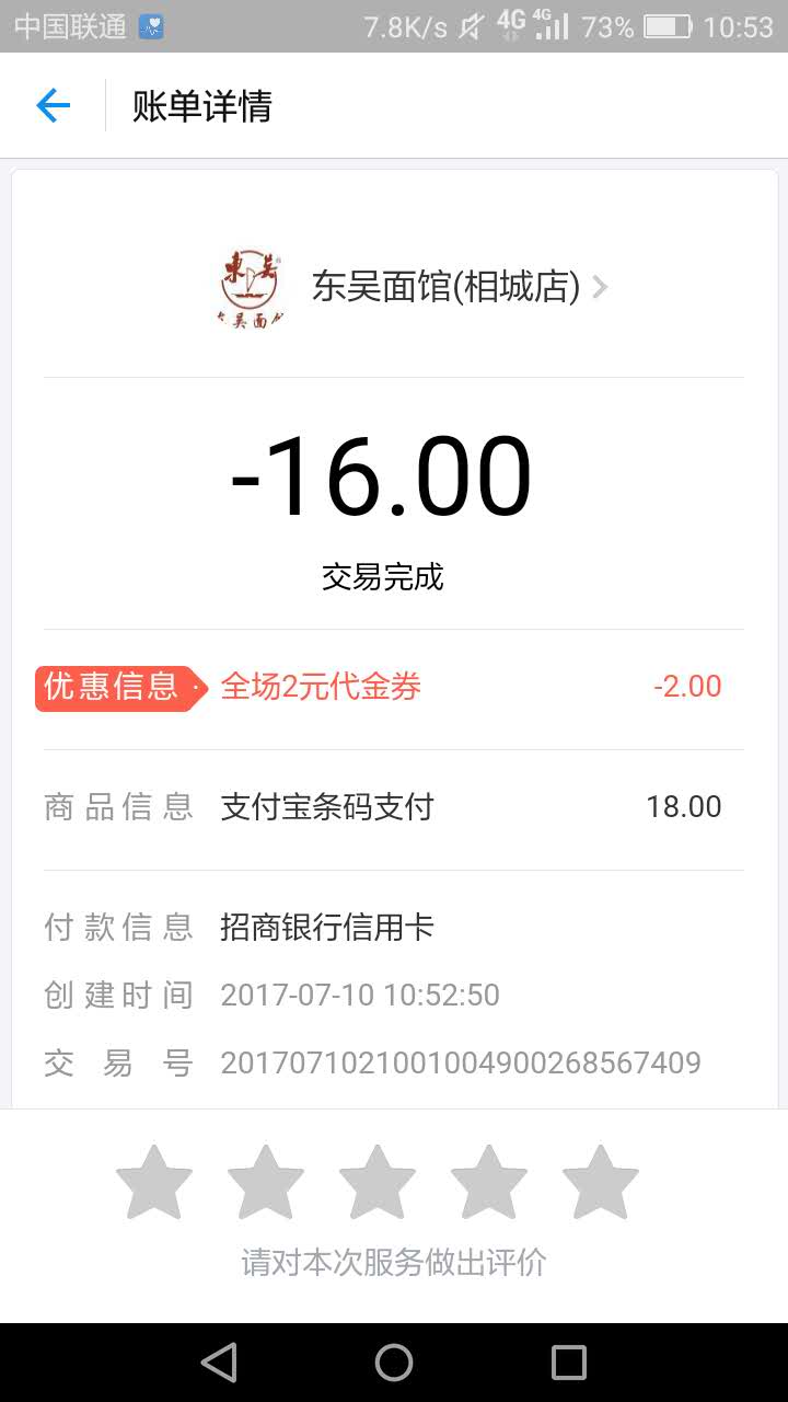 网友2017-07-10味道超级棒,还有支付宝活动,原本想点个12.13元的面的,看有活动,随便点了个18元的面,哈哈...味道超级棒,还有支付宝活动,原本想点个12.13元的面的,看有活动,随便点了个18元的面,哈哈,厉害了我的东吴。