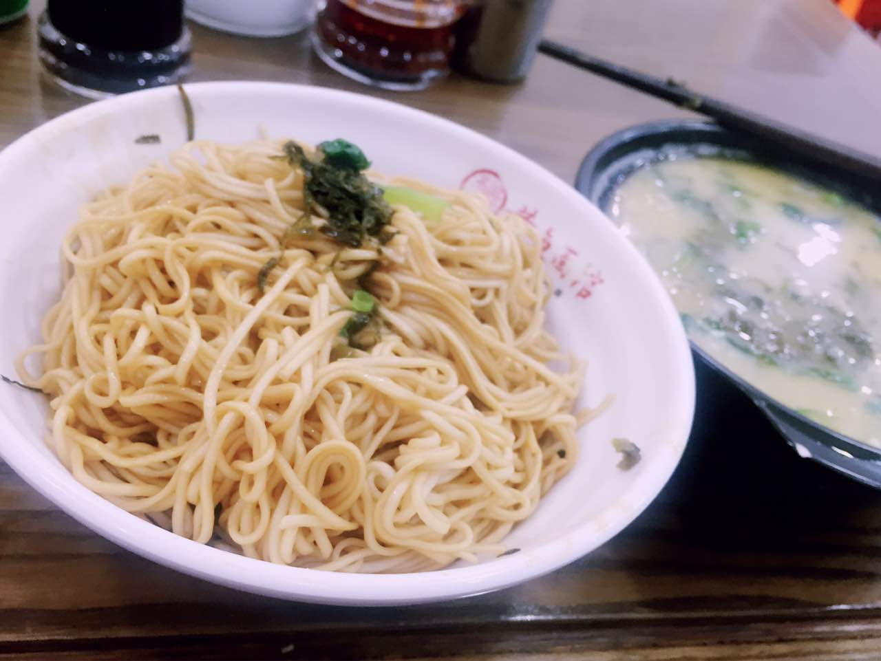 环境不错,小小的店干干净净的。免费加面加雪菜,雪菜黄鱼面砂锅配葱油拌面28元,还蛮好吃的。