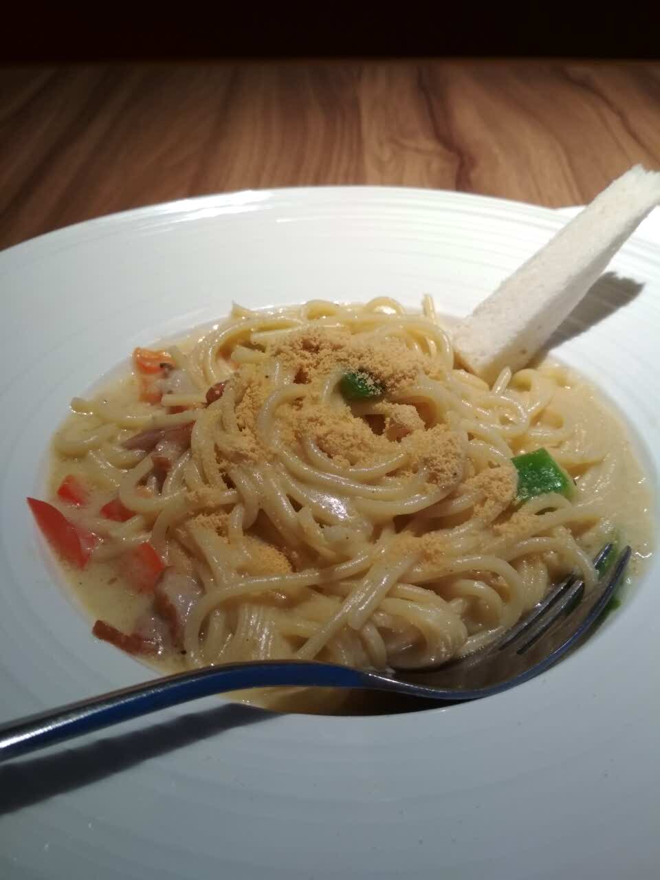 ...人而言勉强接受,一整盘意面,奶油和意面还不错,培根虽然撕碎了,但是实际上可能连一整片培根都没有服务很一般,东西味道还行,有会员卡打了折之后价格我个人而言勉强接受,一整盘意面,奶油和意面还不错,培根虽然撕碎了,但是实际上可能连一整片培根都没有