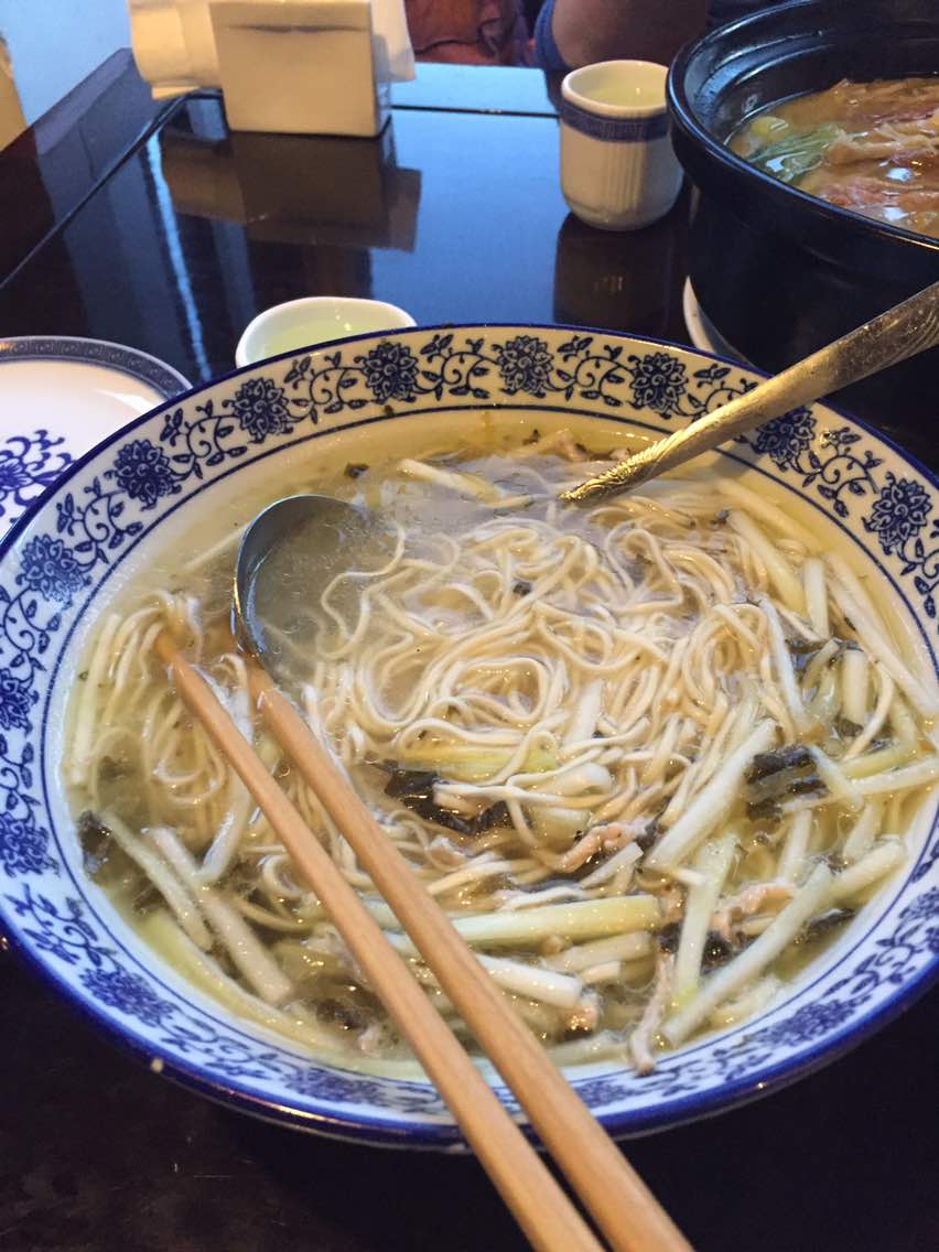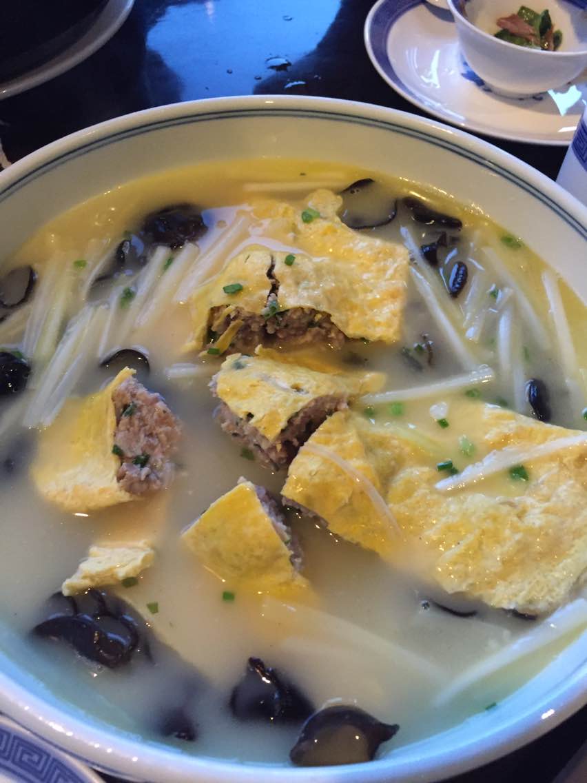 河边的小店。服务非常好。直接支付宝扫二维码下单、加菜、结账,好方便。笋干鸭煲很大一煲,上菜前服务员还帮忙去骨了,3大1小全清;蛋饺肉很柴,吃货表示加生粉,油,水去打肉糜,再来做这个菜不是更好吗?面条吃不惯,面黏黏的,没有弹性。