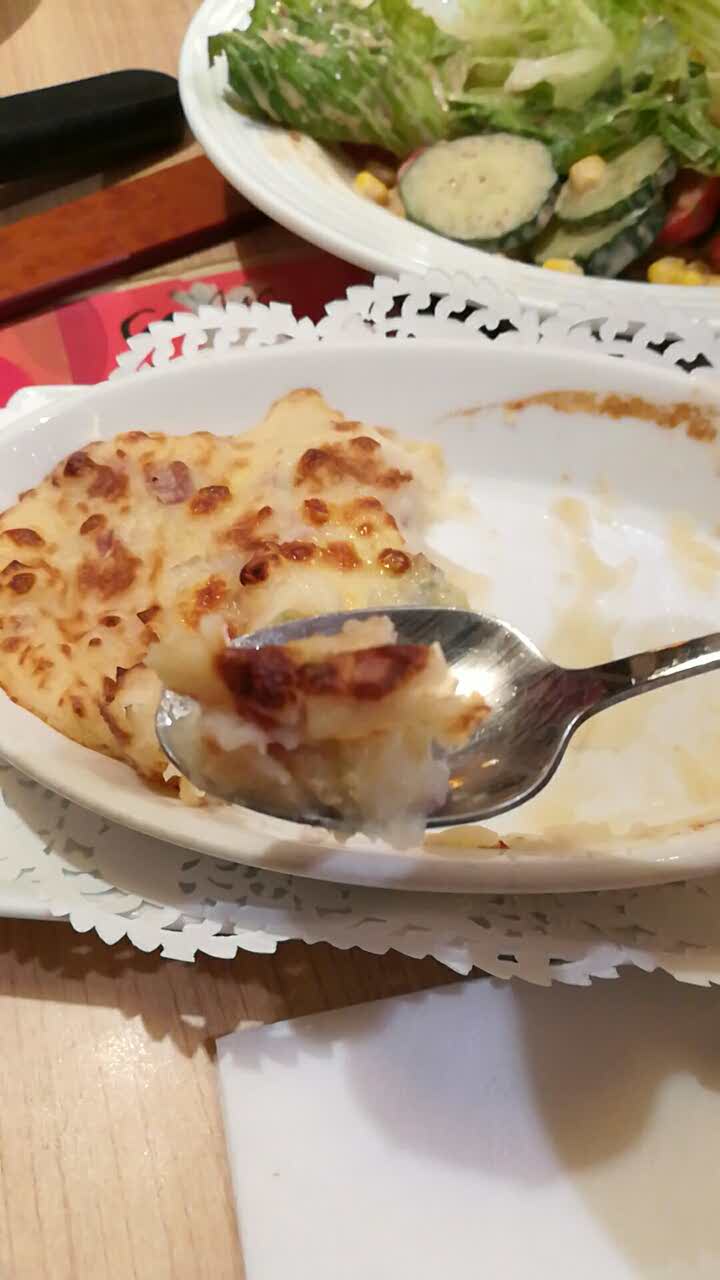 东西很好吃啊 特别是披萨 这家店的土豆泥做的很好吃 蛋糕也很棒 赞!