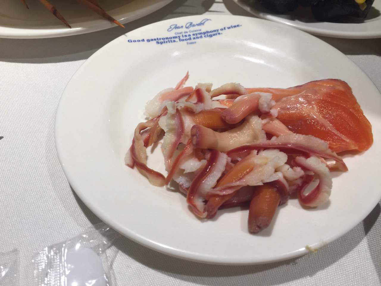 三文鱼很新鲜,螃蟹也很大,而且黄好多,牛排煎的也很好,还有正宗羊肉串现烤。