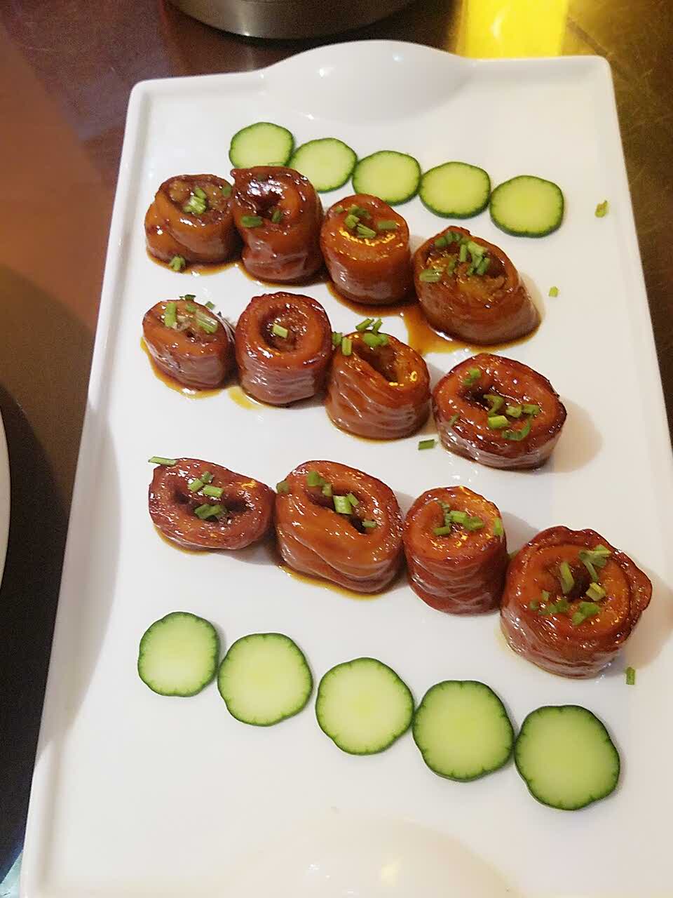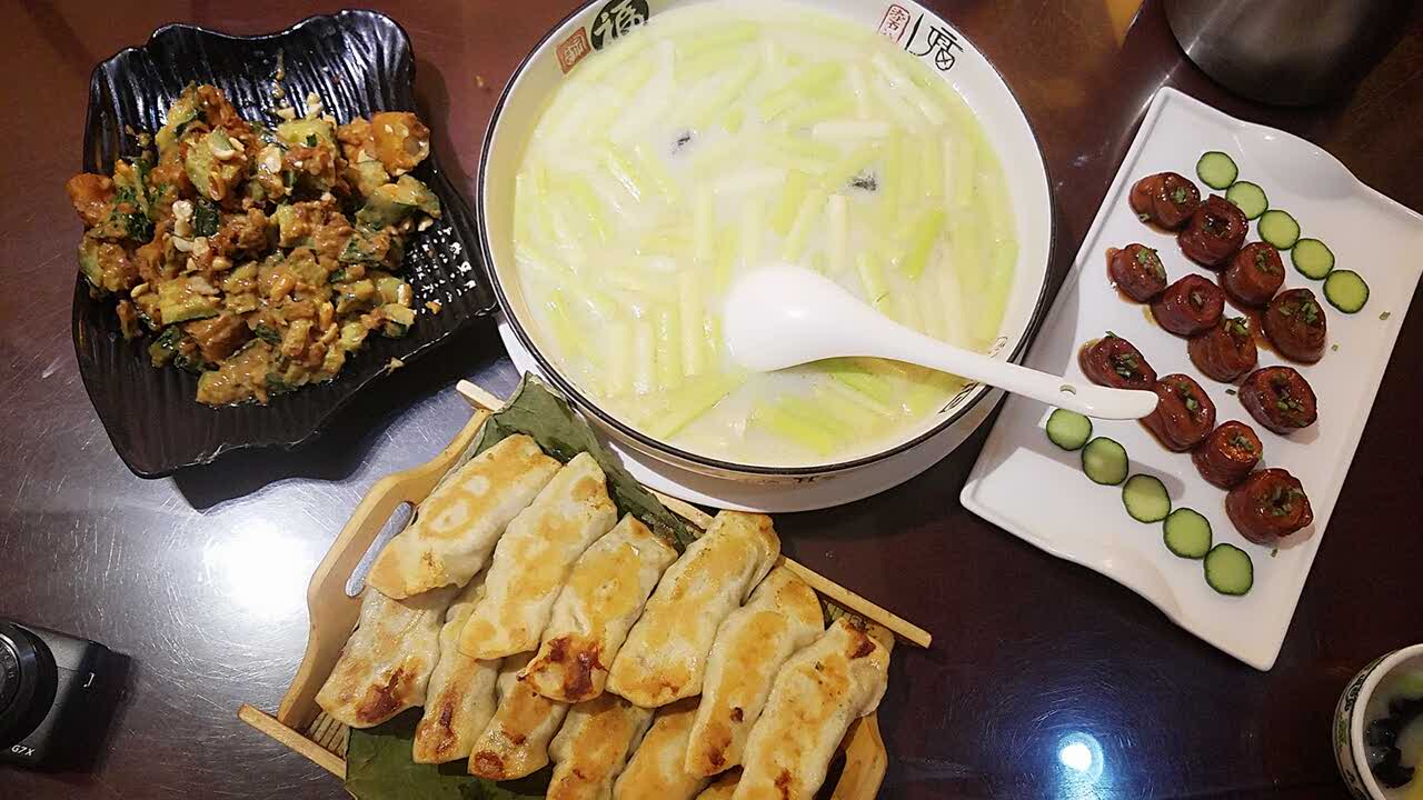 九转大肠没觉得特别,锅贴面太厚了,奶汤蒲菜和黄瓜拌油条不错