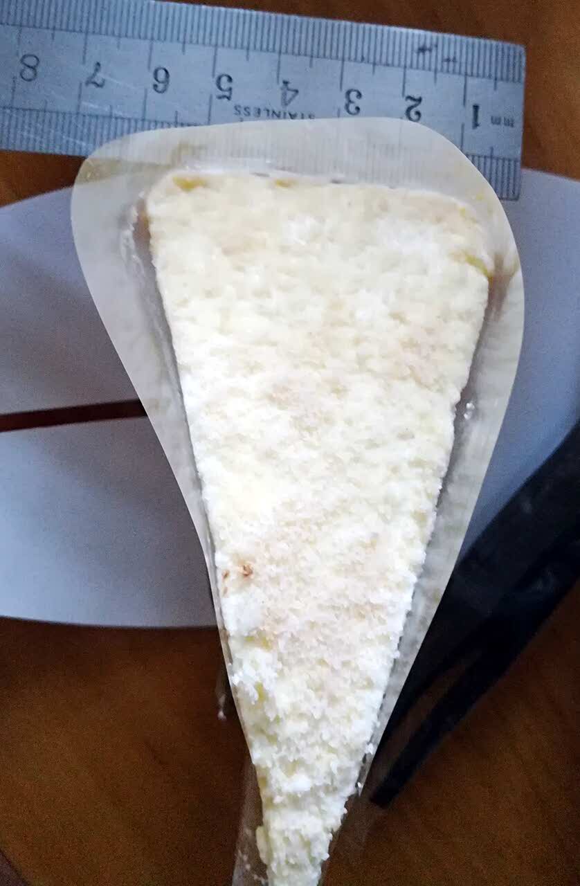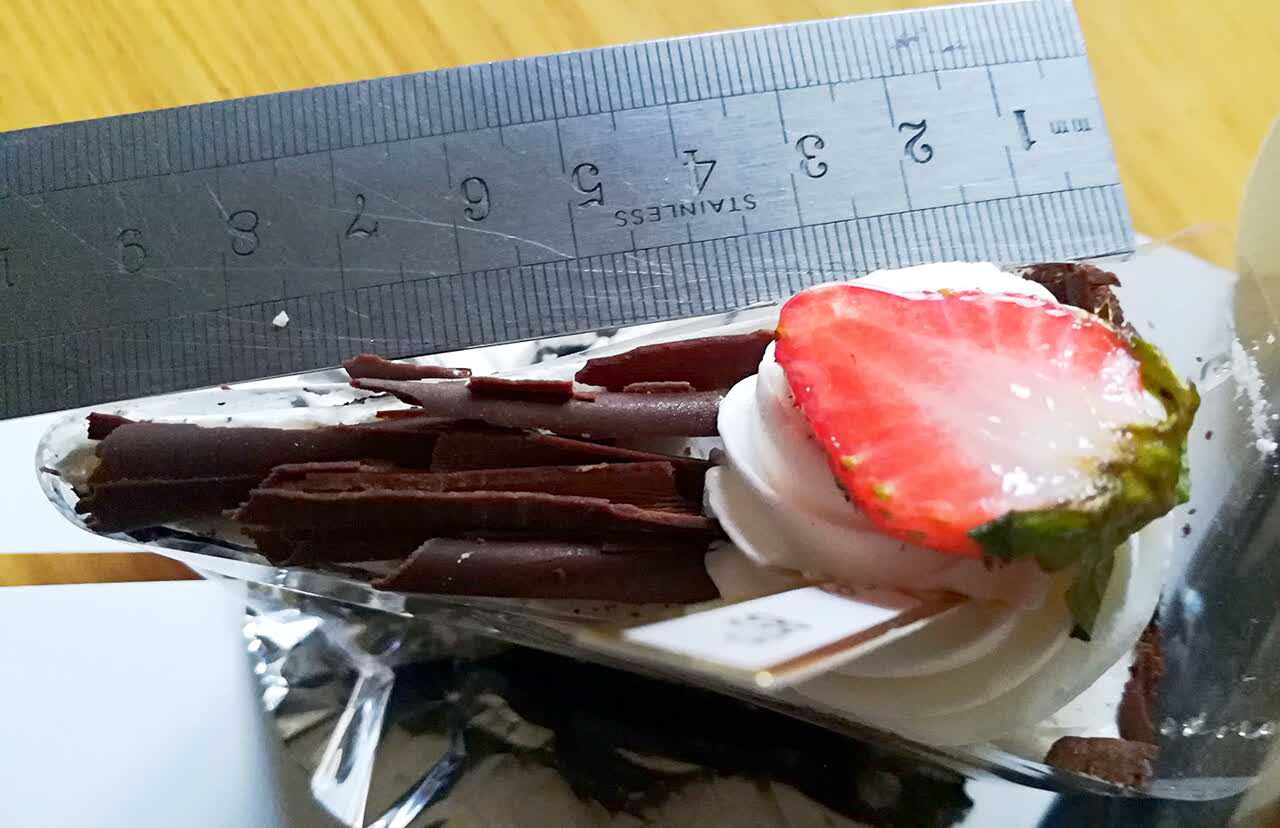 斜边长度还不够9厘米,跟柜台里第一排的几块差不多小了四分之一,是不是一个蛋糕比平时多切出两块来...