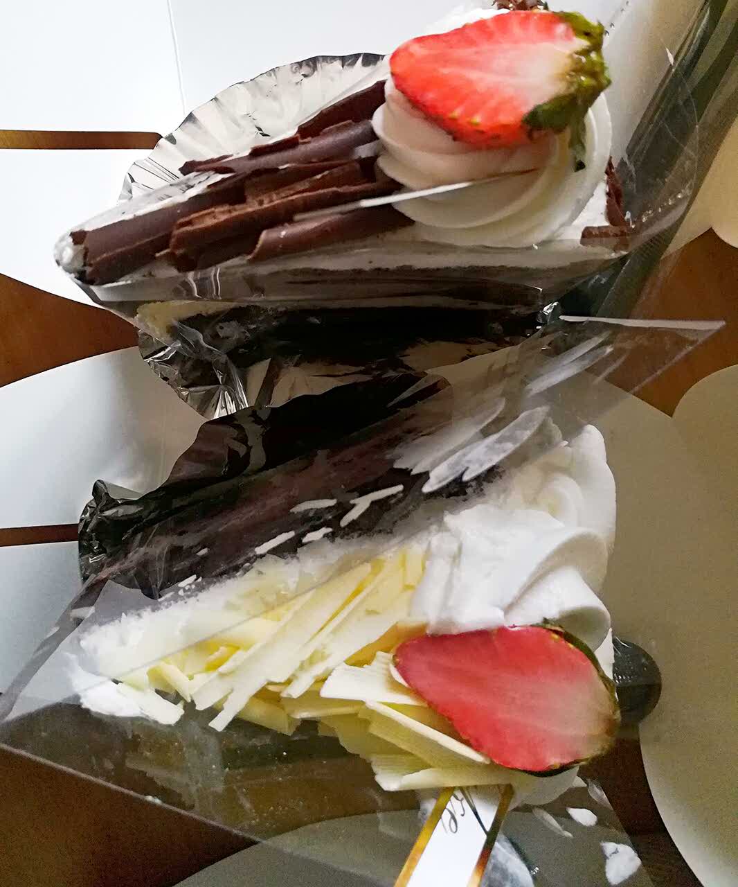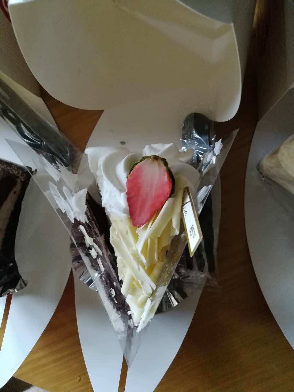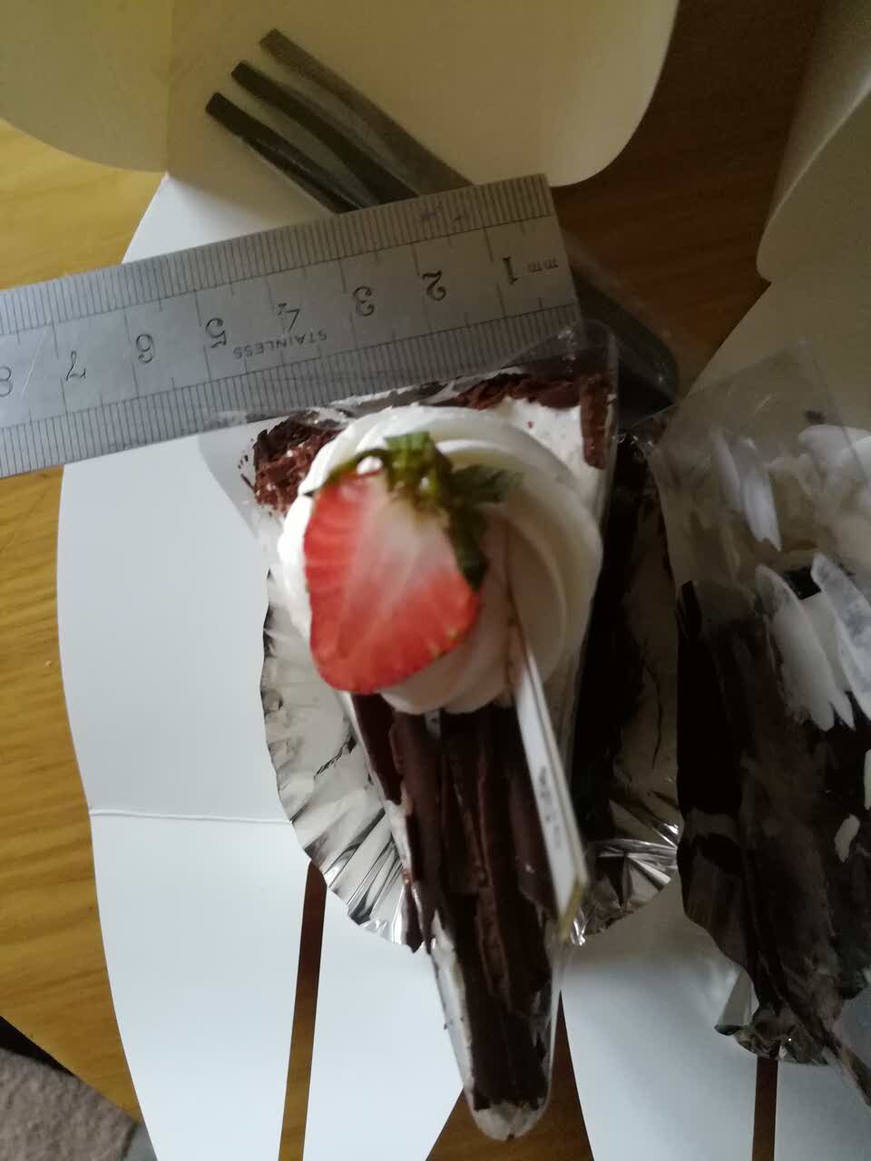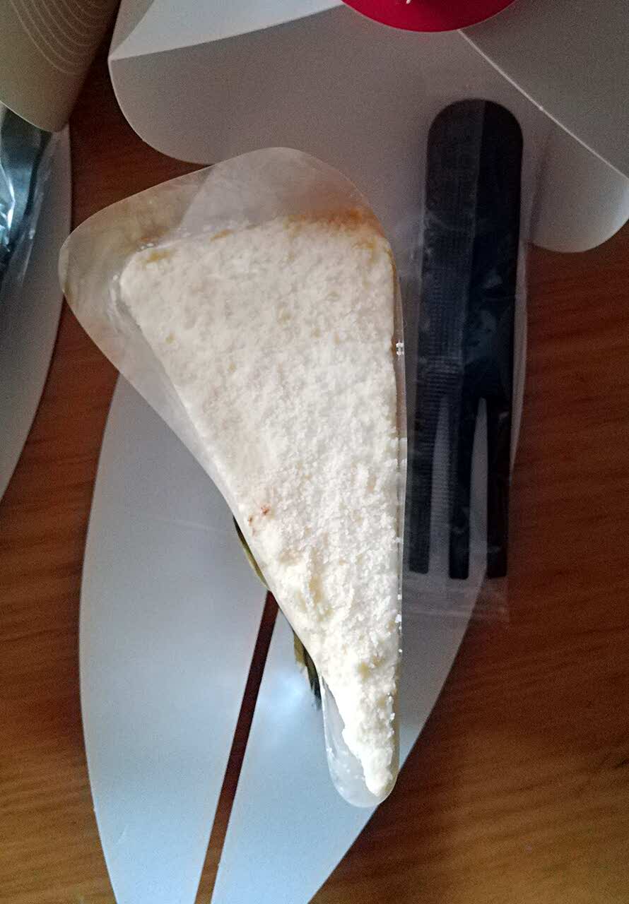 虽然是双十二,但我不只买这一家,所以是原价购买,没有享受优惠,买回家才发现蛋糕比平时小了不是一点点,其中一块宽度五厘米都不到,斜边长度还不够9厘米,跟柜台里第一排的几块差不多小了四分之一,是不是一个蛋糕比平时多切出两块来搞活动的,一直喜欢85C的蛋糕面包,可是这次真的一颗星都不想给,大家看照片吧,蛋糕还没叉子长。