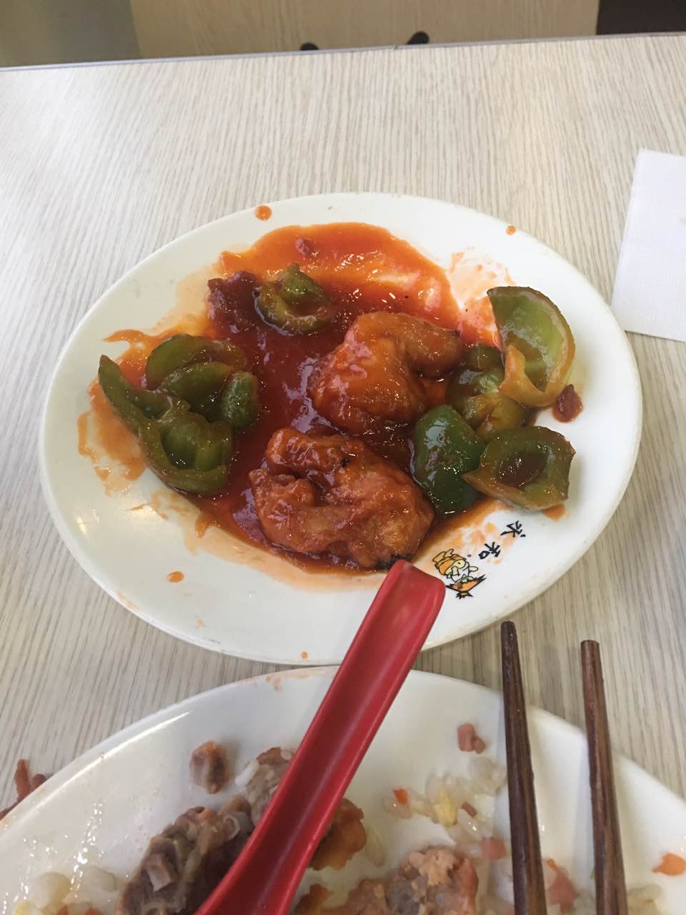 味道还可以,蛋炒饭不错,之前吃的麻辣豆腐也很好,今天吃的糖醋排条,吐出来了钢丝球的钢丝