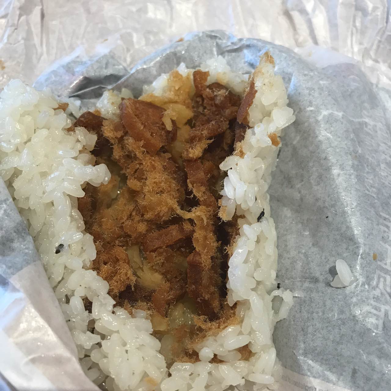 来尝尝鲜!米饭有点硬!肉松好多!我以为果着整根油条,可惜不是!吃过了,就算了!