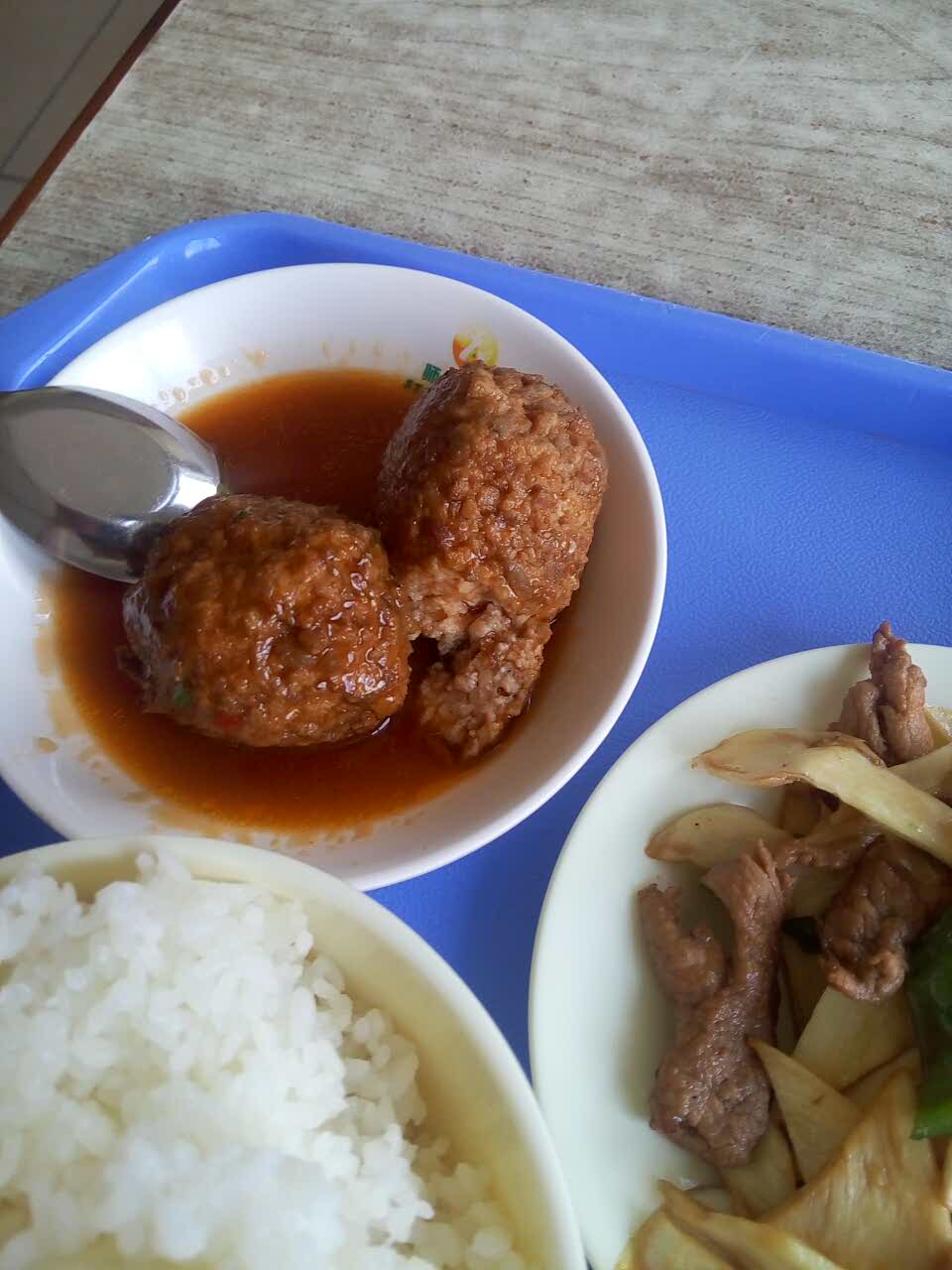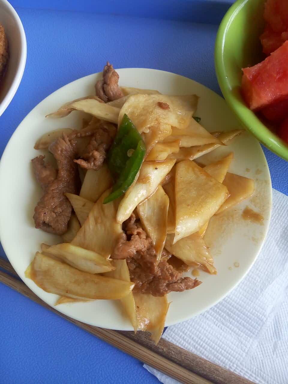 狮子头加茭白炒肉加西瓜~天气好热,师大人家的饭菜蛮好吃的,不过就是有点贵