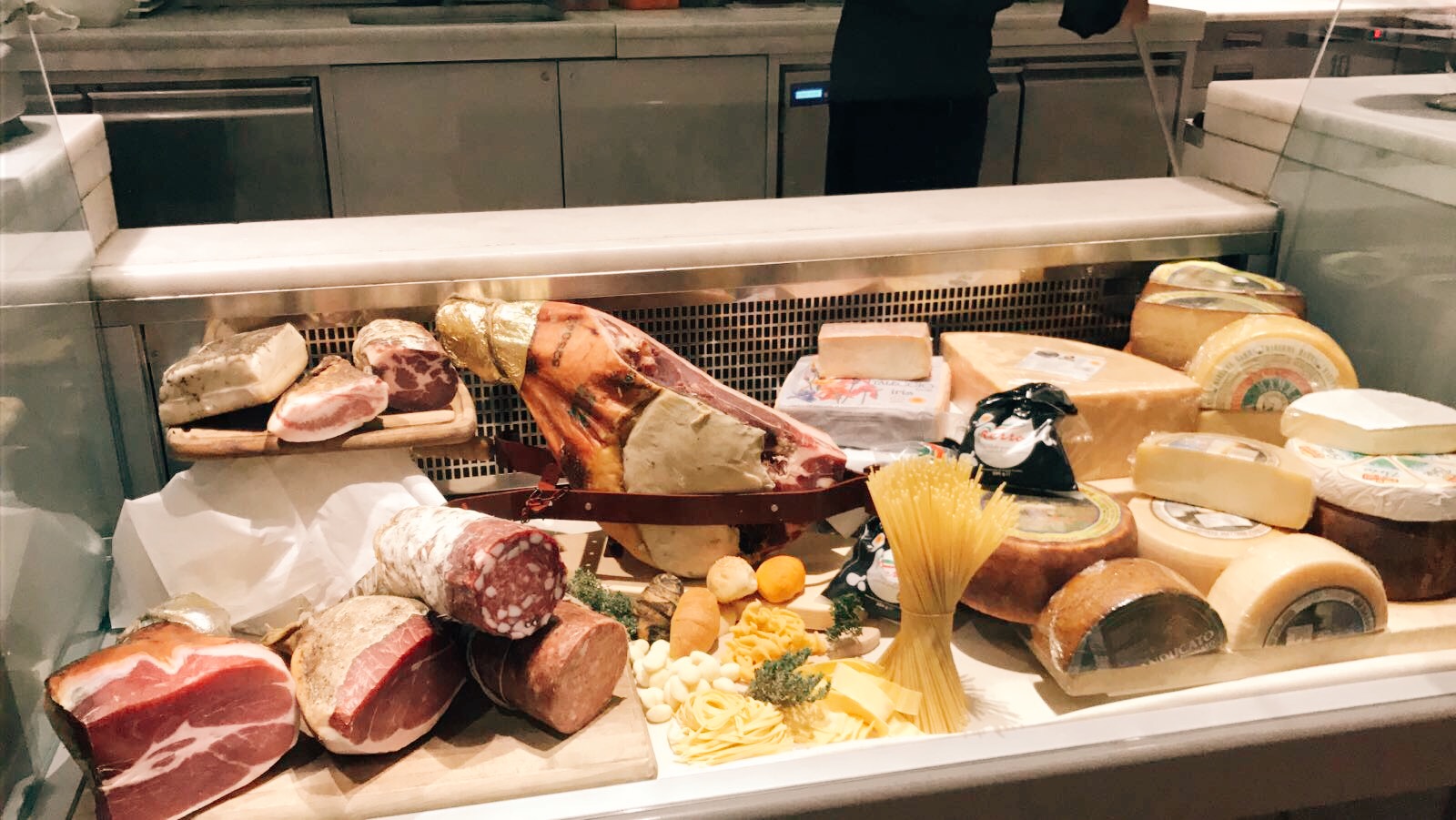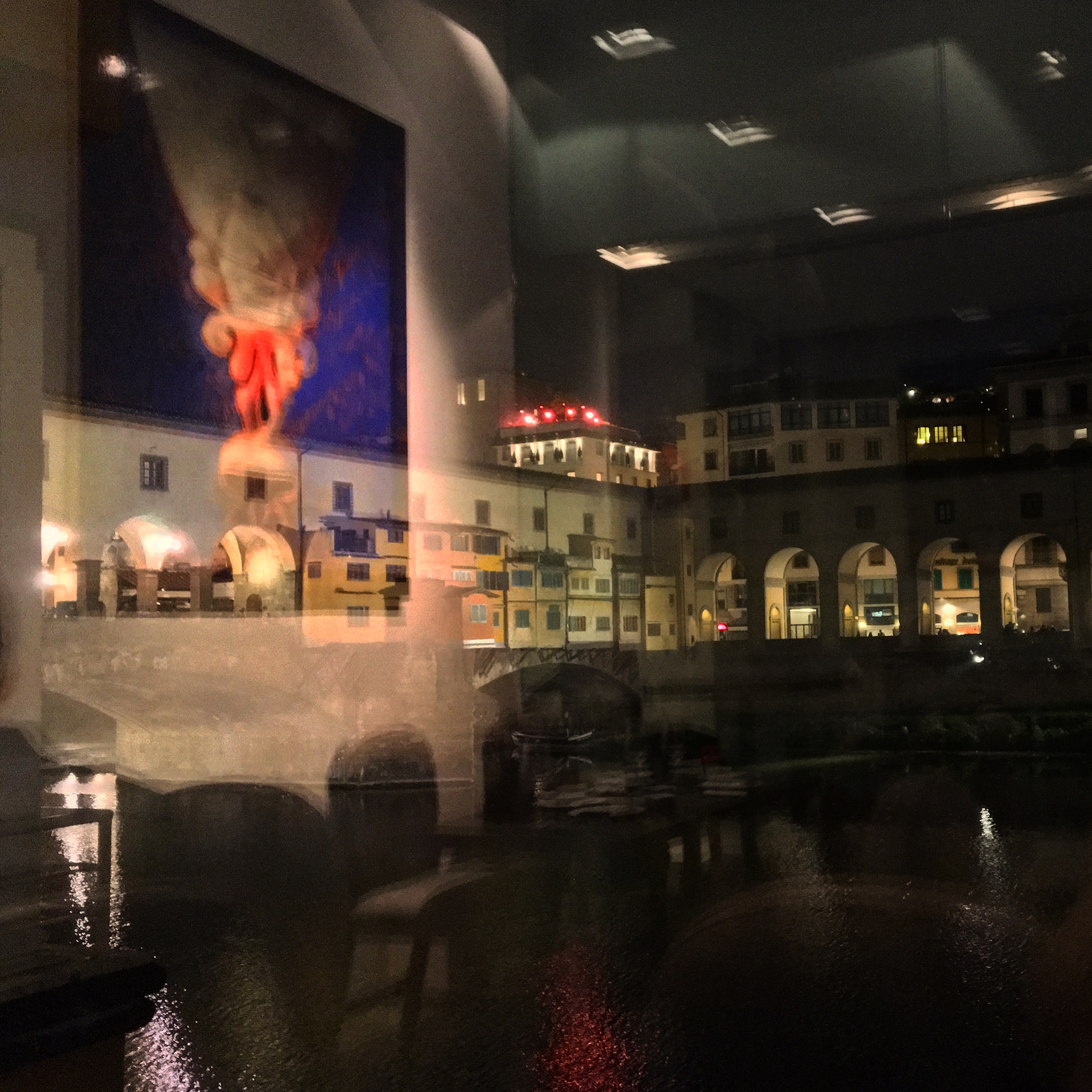 9月去佛羅倫斯旅行,和在佛儸倫斯留學的朋友在這裡聚了一下,聽聞是以魚類佳餚而聞名佛儸倫斯,朋友在實習工作中,她的同事都覺得值得紀念的日子適合去Golden View, 尤其是第一次來佛羅倫斯的人,絕對是震撼的!在靠窗的位置享有的是世界獨一無二的老橋美景, 雨後的阿諾河水量充沛,倒影著老橋的美景。既然難得找到一家環境視野都非常好的餐館,雖然菜單上有平價料理,但忍不住輕奢了一下,点了牛肝菌, 鴨肉,佛儸倫薩腌牛肉,兩個人吃晚餐加酒差不多130歐元,夜景沉靜優雅, 適合慢慢用餐,和伴侶、友人共度如森林的時間一樣緩慢流淌的時光,櫥櫃里展示著佛儸倫薩的代表食材。