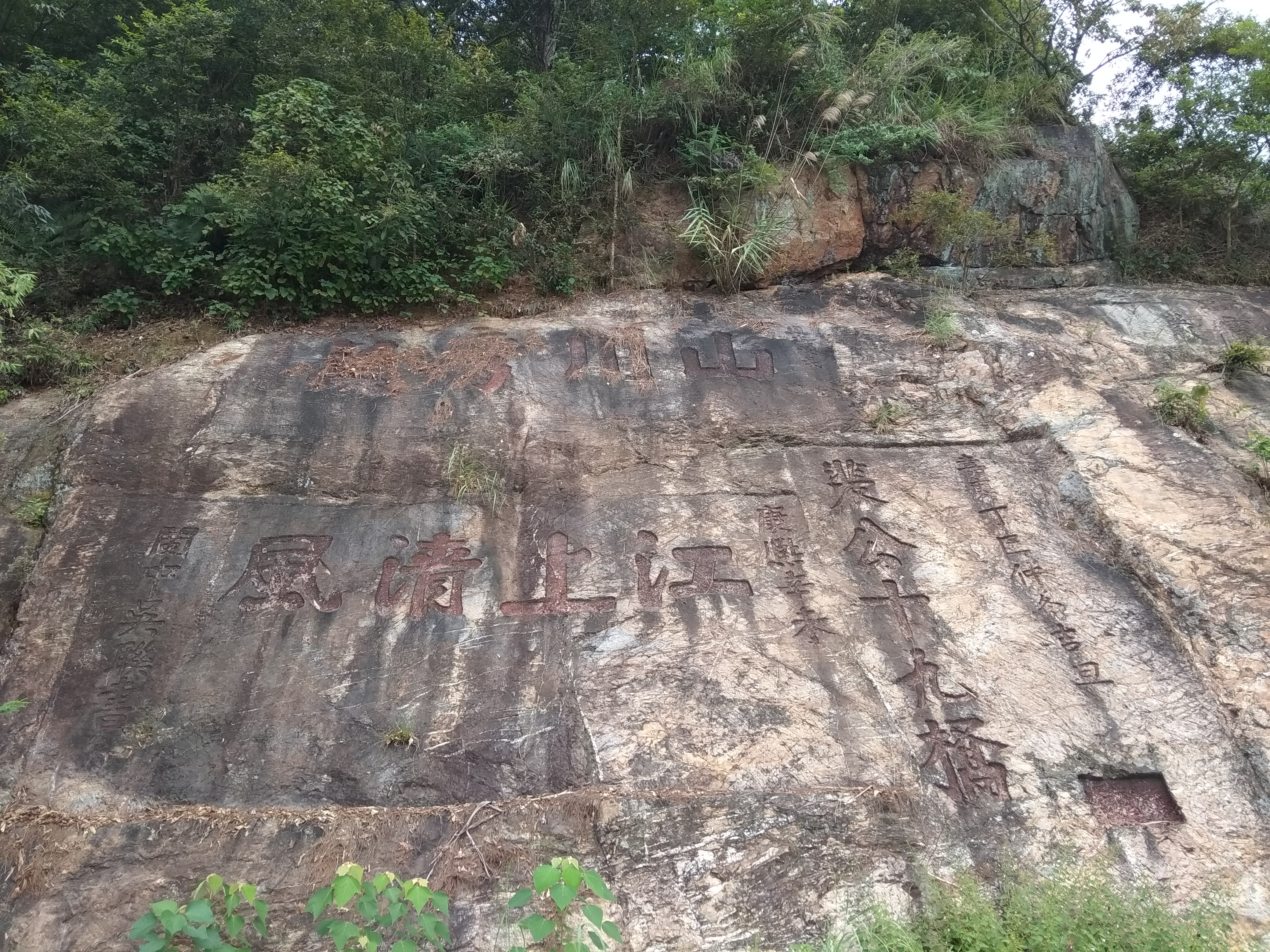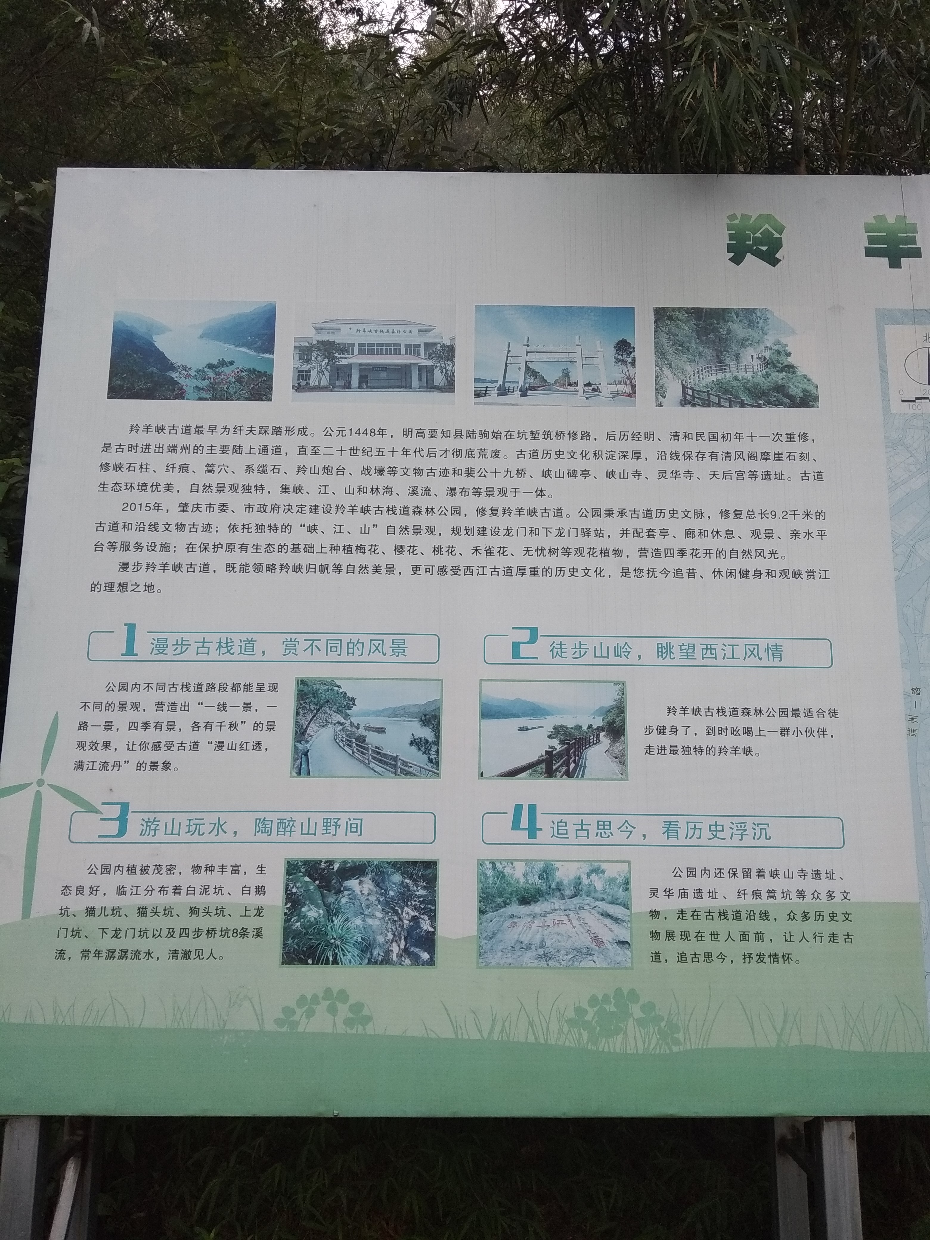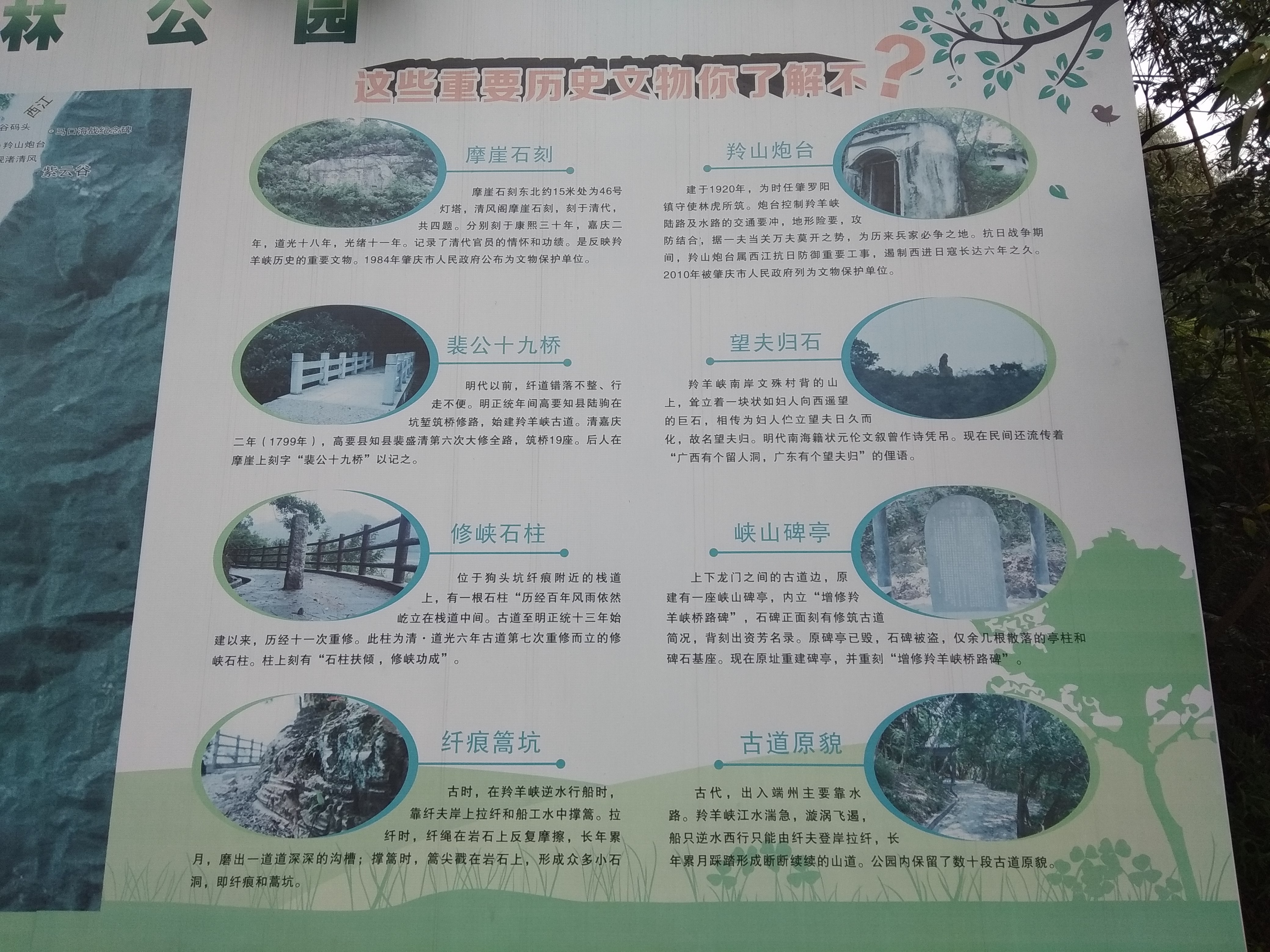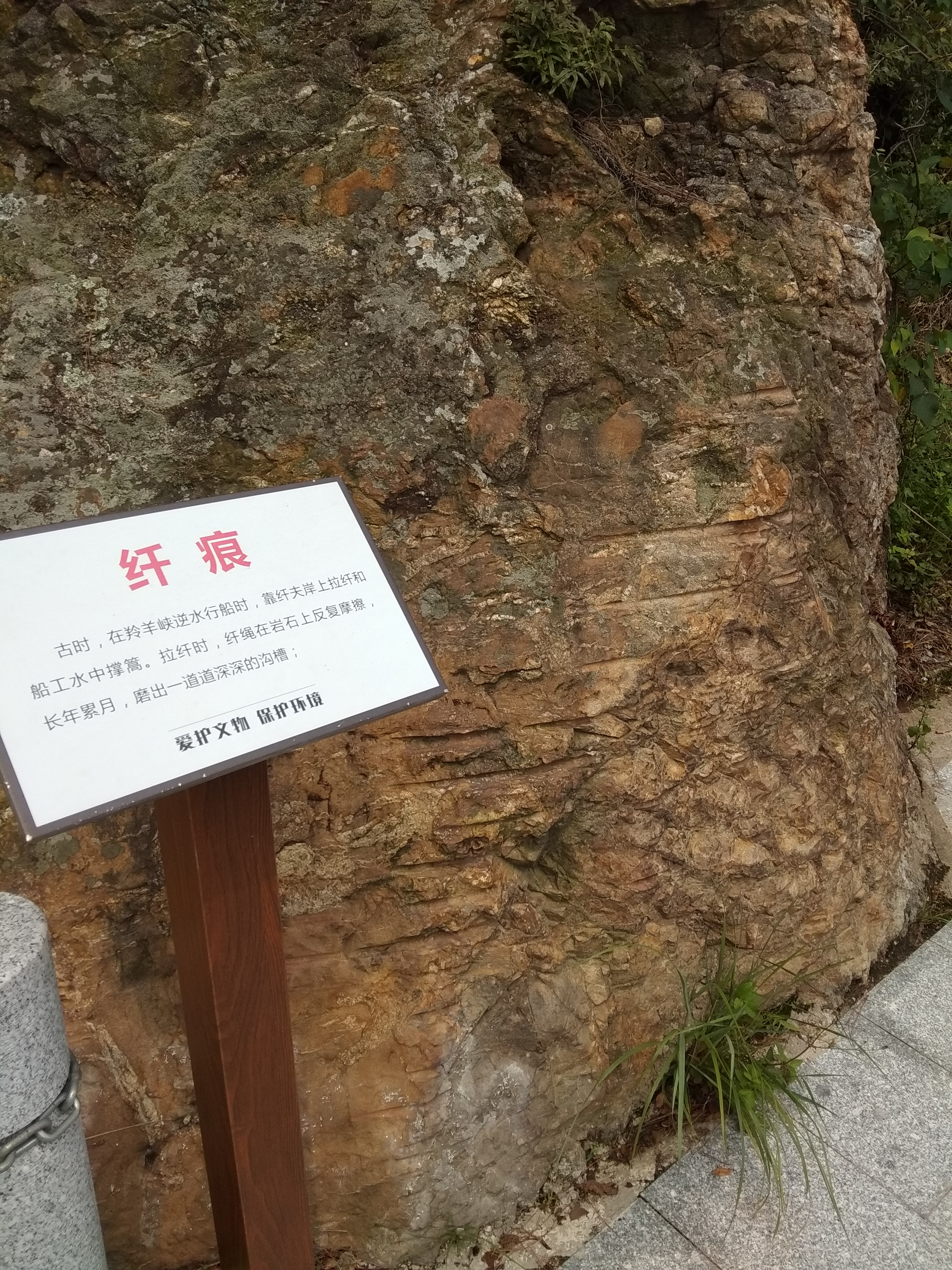 石壁上纤痕宛在,遥想当年纤夫的艰辛; 这20里的峡谷当年一日过不去,故在中途有古寺做羁旅之用,如今寺庙不存,不过将来会恢复吧,看规划上这羚羊山上有峡山古寺文化区等区域; 中途有小亭歇息,可补充饮水食物,毕竟现在景区刚运行了一年,各项硬件设施已经不错了; 只能步行,将来规划是可开车的;这次走遍全程,实无力气和时间再原路返回,于是几人租车50元又返回原入口,两入口处都有免费停车场,也有公交站点,需转车两三次才能到;免门票;栈道早6点到晚6点开放; 有摩崖石刻、望夫石、古炮台、峡山碑亭等遗址,历史文化积淀深厚; 多马尾松、对叶榕、乌桕等植物;沿江逆流而上,江风浩荡,轮渡往来不息,溪流潺潺,鸟声婉转,峭壁直立,绿水回旋,抚今追昔,饱览江天山川胜景。