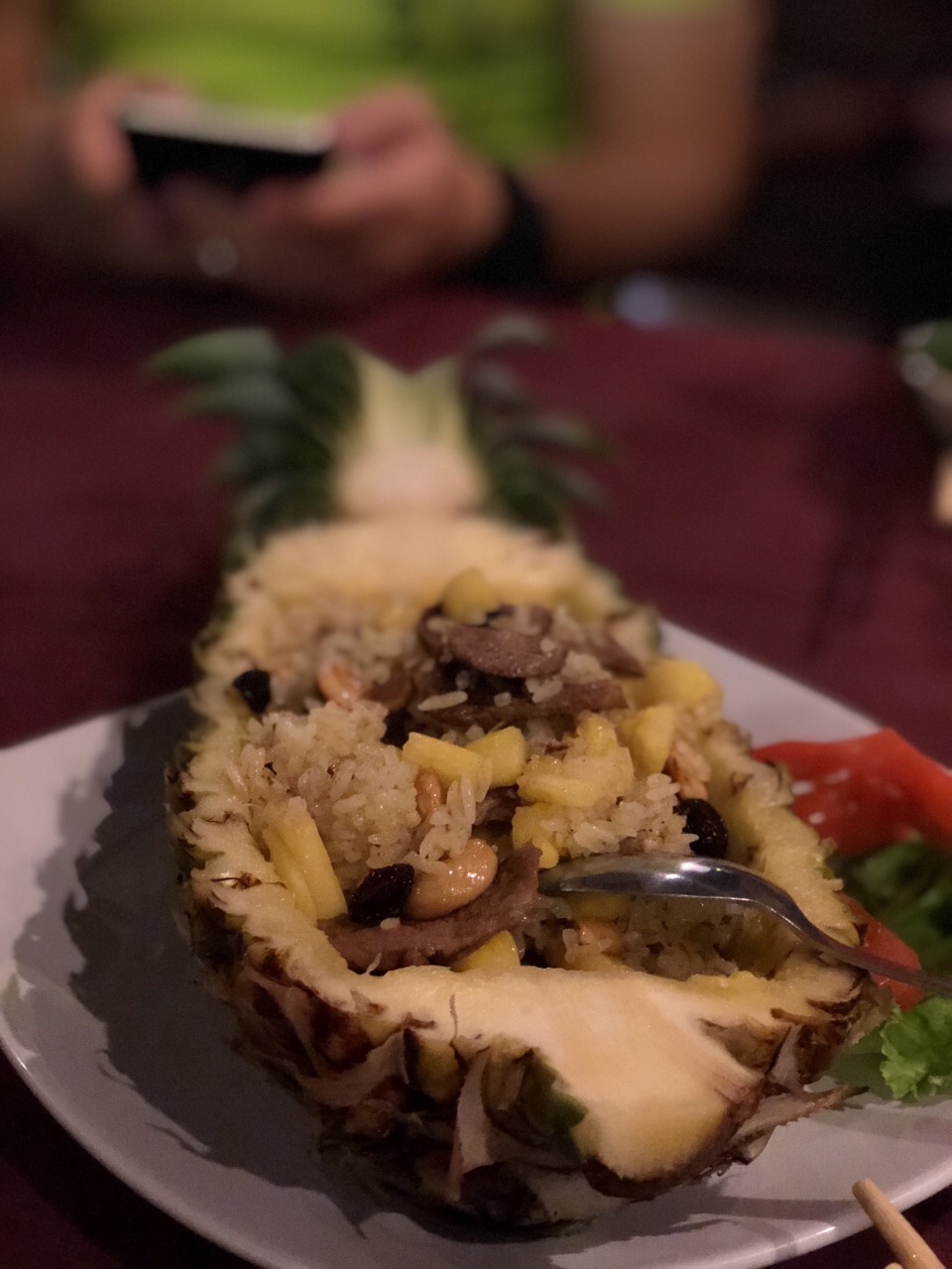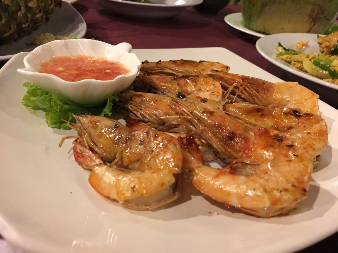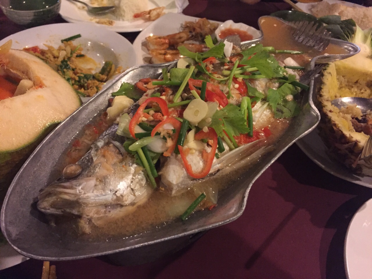 误打误撞入的店,没想到口味还不错。推荐冬阴功汤,应该是改良版的,没这么重口味,关键是装在椰壳里的,椰香味更佳浓郁! 四人点了咖喱螃蟹,烤虾,空心菜,柠檬鱼,冬阴功汤,菠萝炒饭和4杯饮料,共计1250铢,超高性价比了!
