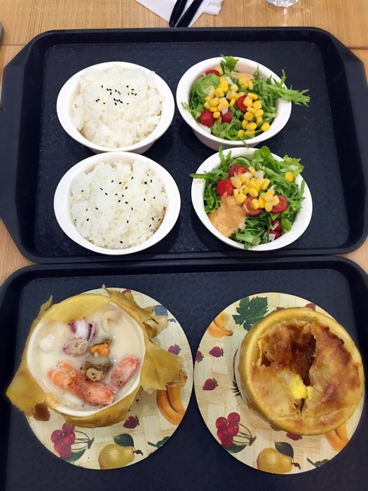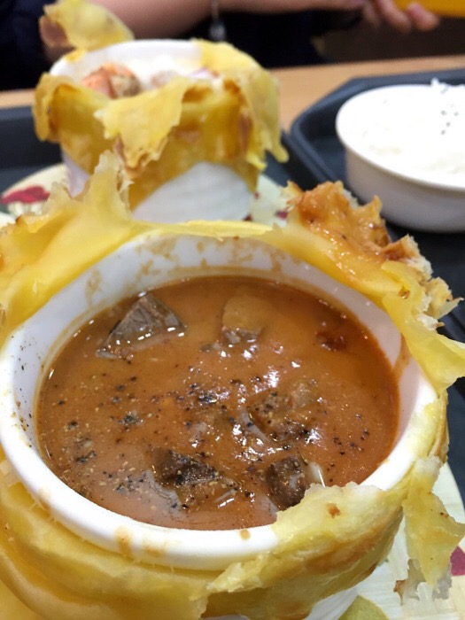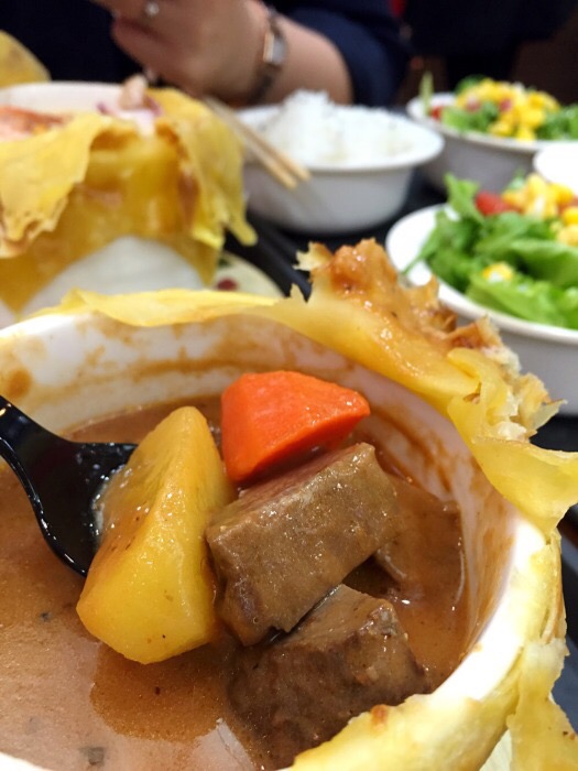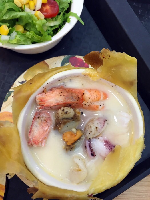 老猫记上了新品,酥皮浓汤饭,我是酥皮控,和小伙伴立刻冲过去了^_^ 我选了酥皮牛肉浓汤饭套餐,一份酥皮牛肉浓汤,一份蔬菜沙拉一碗米饭,酥皮真香,一点也不腻,蘸着牛肉浓汤吃好棒!牛肉汤汤里好多大块牛肉~,就是感觉酥皮不过瘾,不知道能不能加双份的酥皮嘿嘿$_$ 今天老板心情好,一直笑眯眯滴^_^