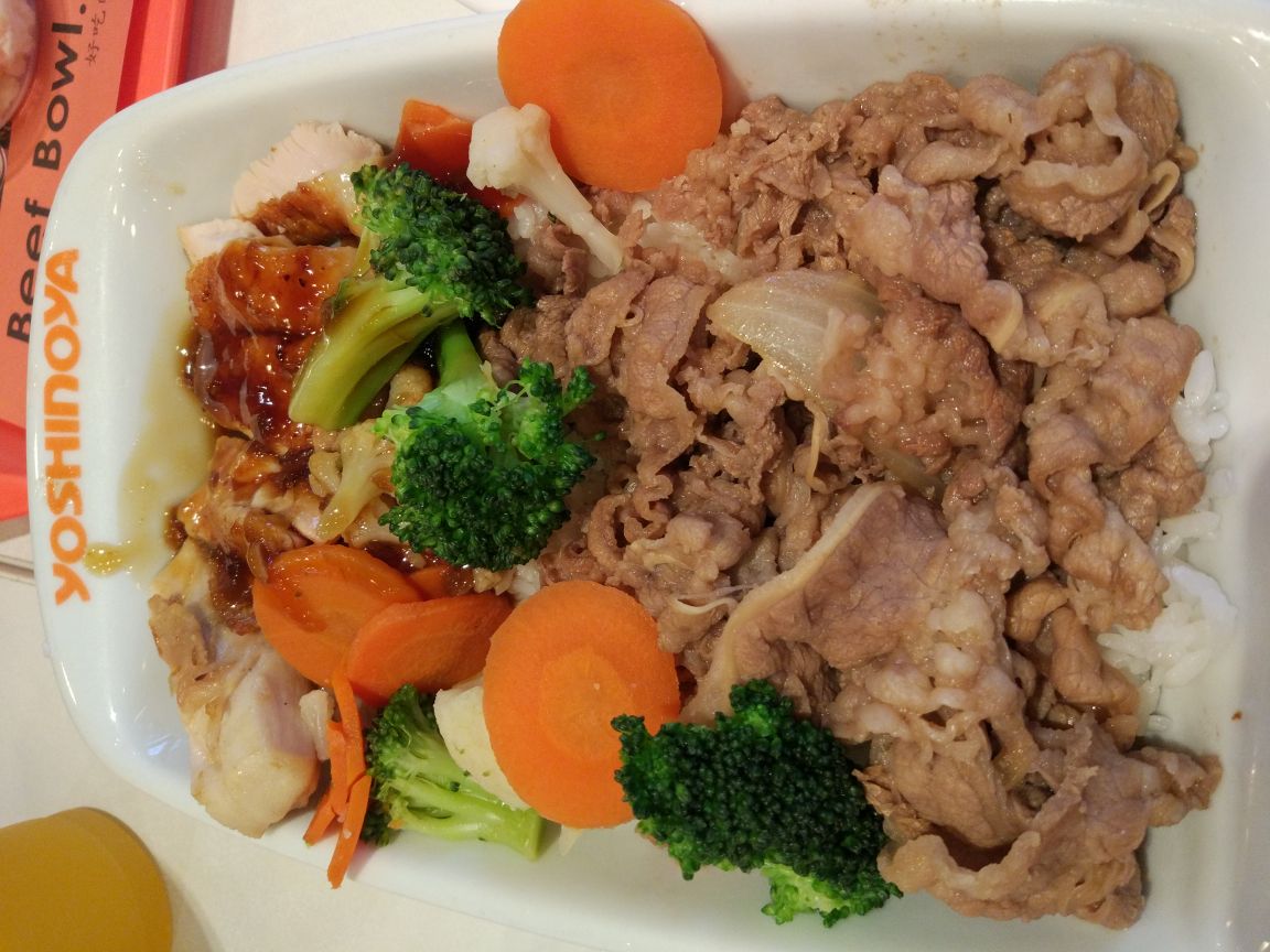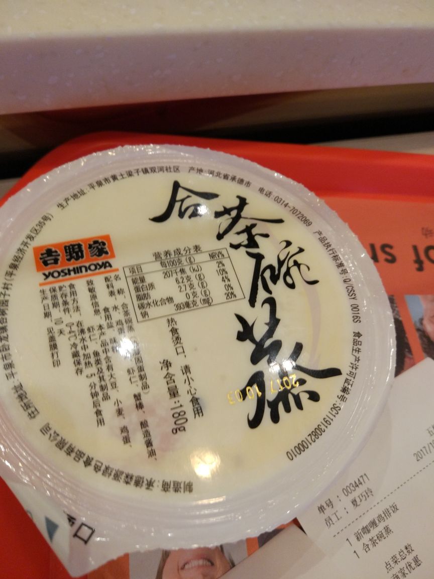 真是好久没吃吉野家了,推出了好多新品,今天来五棵松蓝色港湾的耀莱看电影,由于要赶时间,所以赶紧来吃个快餐解决晚饭。 正巧赶上饭点儿,吃饭的人还真不少,点餐还要排个小队儿。服务员真是超有耐心,真的得给一个大大的赞!十一期间许多优惠券都不能使用,服务员给推荐了吉野家的支付宝会员卡,新申请的会员卡可以赠送6张优惠券,当天当餐就可以使用,非常实惠。我当时就办了一个,使用了两张优惠券,一个是免费的茶碗蒸,还有一个是点套餐立减5元。 快餐就是方便,这边点完餐,旁边的备餐就已经准备好了。吉味双拼饭,基本上只要来吉野家,就会点,这也是吉野家的招牌饭了。新咖喱鸡排饭,头一次吃,个人感觉不去原来传统的咖喱鸡肉饭好吃,这个咖喱汁特别特别咸,没什么咖喱味儿。土豆泥中规中矩。 吉野家的价格基本上人均30多吧,整体4颗星,希望可以做的口味淡一些。