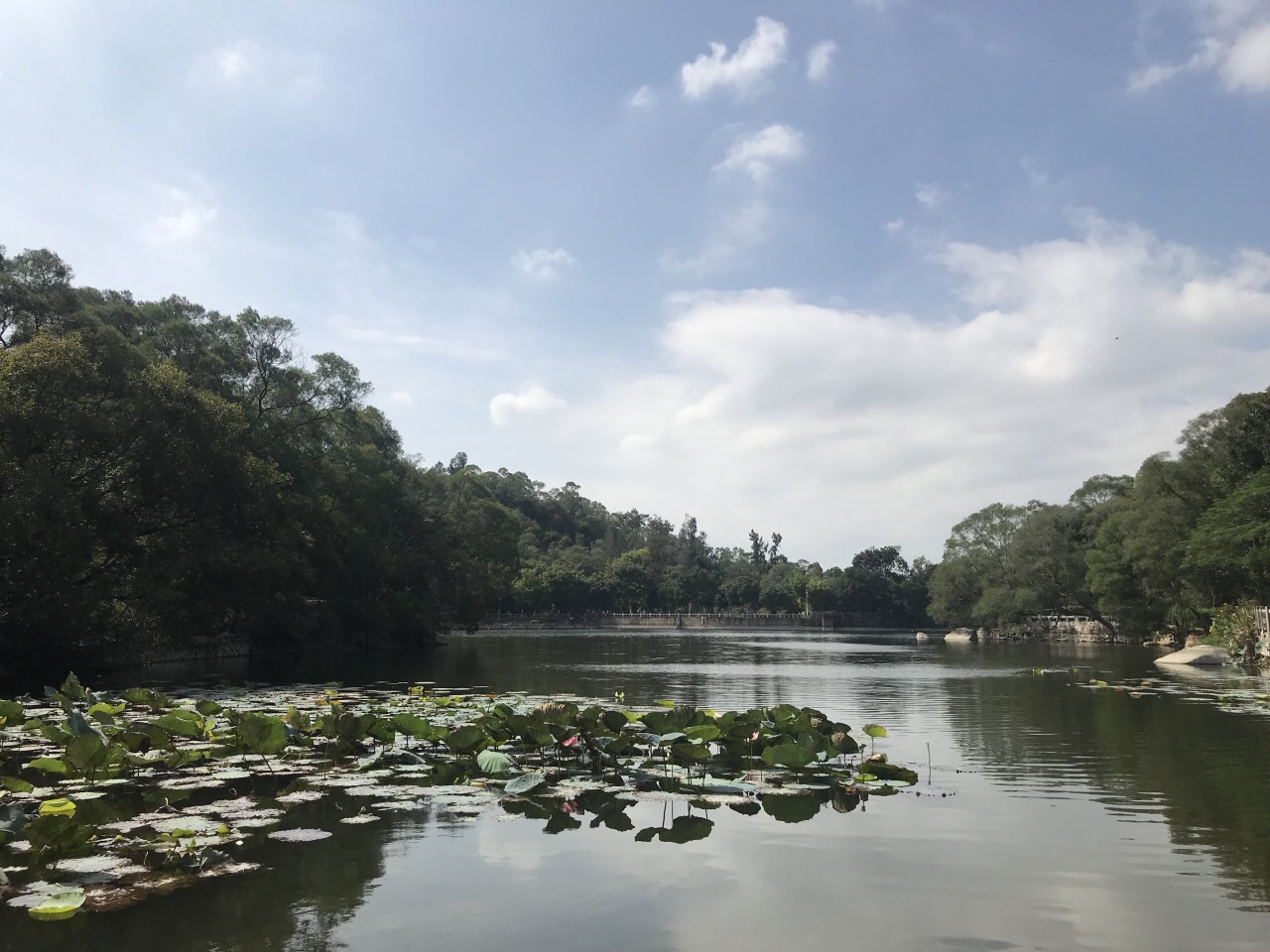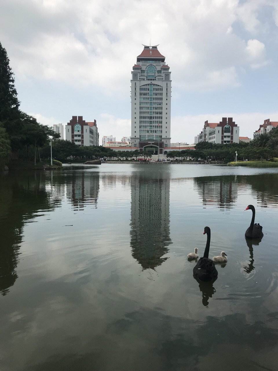 厦大的情人谷景色十分优美,芙蓉湖里养的黑天鹅,增加了两只小天鹅宝宝,一家人在湖里觅食感到非常温馨。
