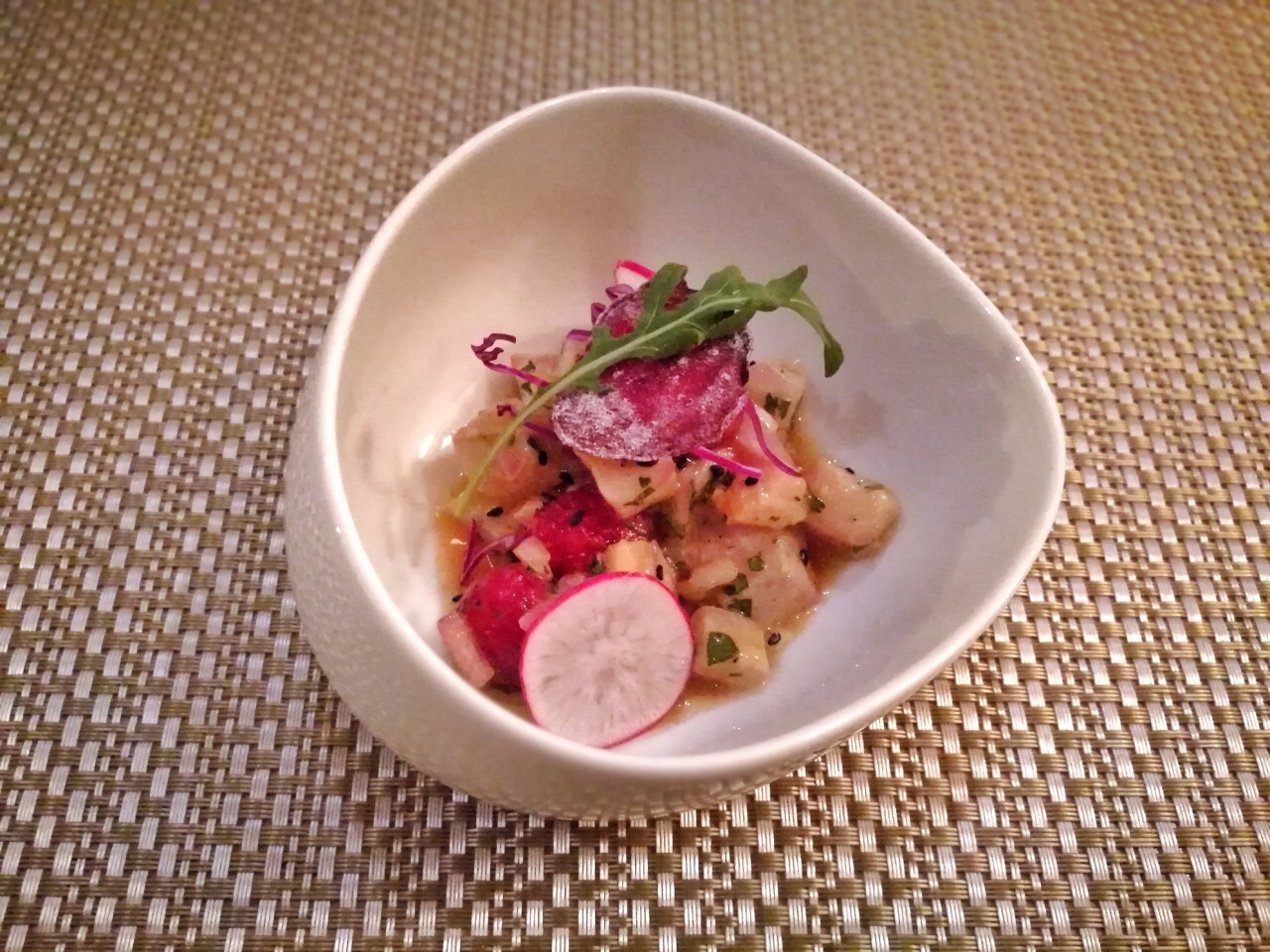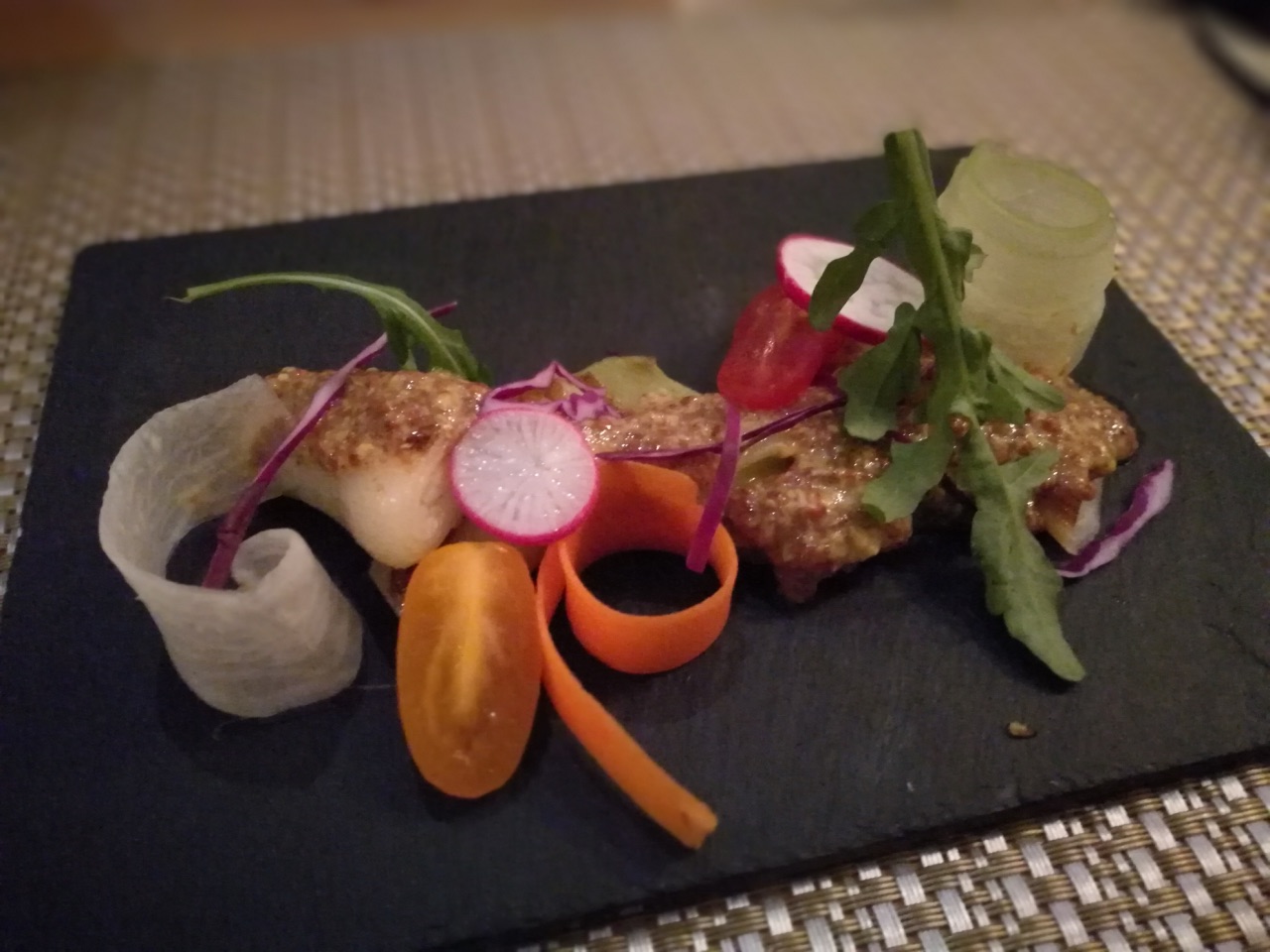 十一假期的最后一天在卡萨布兰卡遇到这家餐厅真的是充满了惊喜,算是我吃过的性价比极高的法国餐厅,摆盘干净不浮夸,味道正宗踏实,服务超级热情,性价比非常高。 白色清新的装修代替了原来的大红色,墙两边布满了画,今日推荐的餐牌写在巨大的黑板上,哪桌点菜时就端到哪桌旁边。菜单全部是法语,服务员也只会说简单的英语,我们点了今日主厨推荐的套餐,两个头盘一道鱼一道肉一个甜品只要400dirham,再加上服务员大力推荐的当地红酒。 第一道是鱼生,切块的鱼生搭配酱汁很像夏威夷的poke,但是比poke精致的多,酱汁清新但却十分入味。 第二道头盘是蔬菜沙拉,主要的食材是葱。第一次大口大口的吃葱,却几乎吃不出葱的味道,酱汁完全覆盖了葱的辛辣。 接着是一道煎鱼,中规中矩的摆盘,看似中庸的一道菜却有着不一般的味道,鱼肉外酥里嫩,搭配的酱汁又恰到好处。 第二道主食是牛肉配紫米饭,牛肉全熟稍微有一点老,但香煎的味道十分棒,这份紫米risotto简直就是天堂的味道,米粒颗颗分明不软不硬口感恰到好处,汤汁包裹着每一粒米粉,每一口的非常饱满。为了减肥戒掉米饭的我,吃干净了最后一粒米。 最后是一道起司蛋糕,味甜而不腻,搭配梅子酱,让不爱吃甜食的我也吃的干干净净,为整顿饭完美画下句号。 这家餐厅在tripadvisor casablanca餐厅里排第二,绝对对的起这个排名。吃过的法国菜finedining不少,尤其在亚洲,主厨喜欢用浮夸的摆盘和稀少的食材做融合法国菜,这种规规矩矩脚踏实地的味道反而不多见了,没想到在北非,这么多年后,还可以吃出法国菜老派的味道。 结账时一看价格,就知道这家餐厅必须要推荐了!