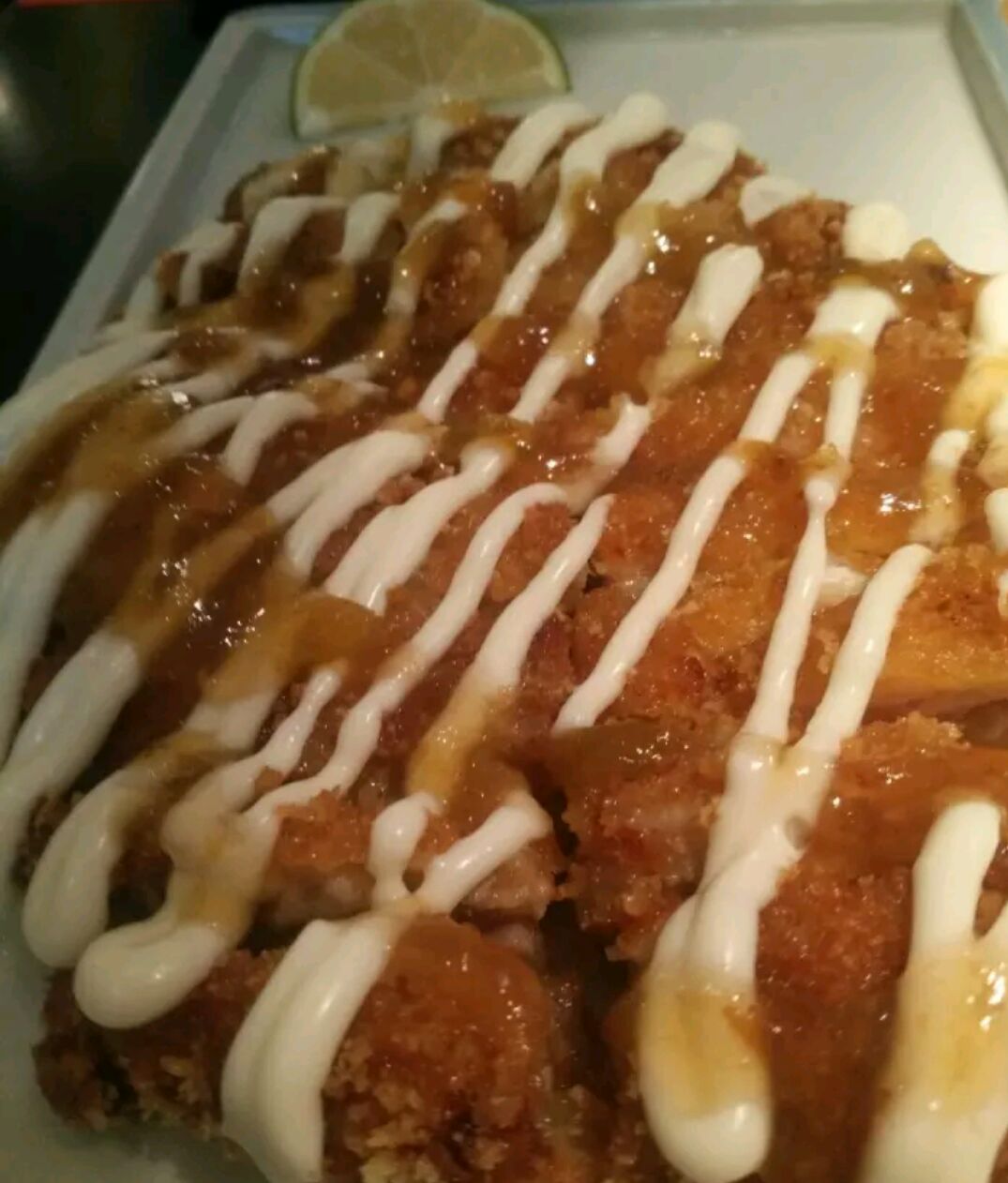 鱼排的肉非常的嫩,虽然是油炸感觉是一点也不油腻的,而且那个酱汁洒在上面口感非常的好,不过如果...