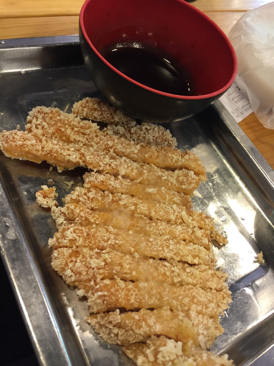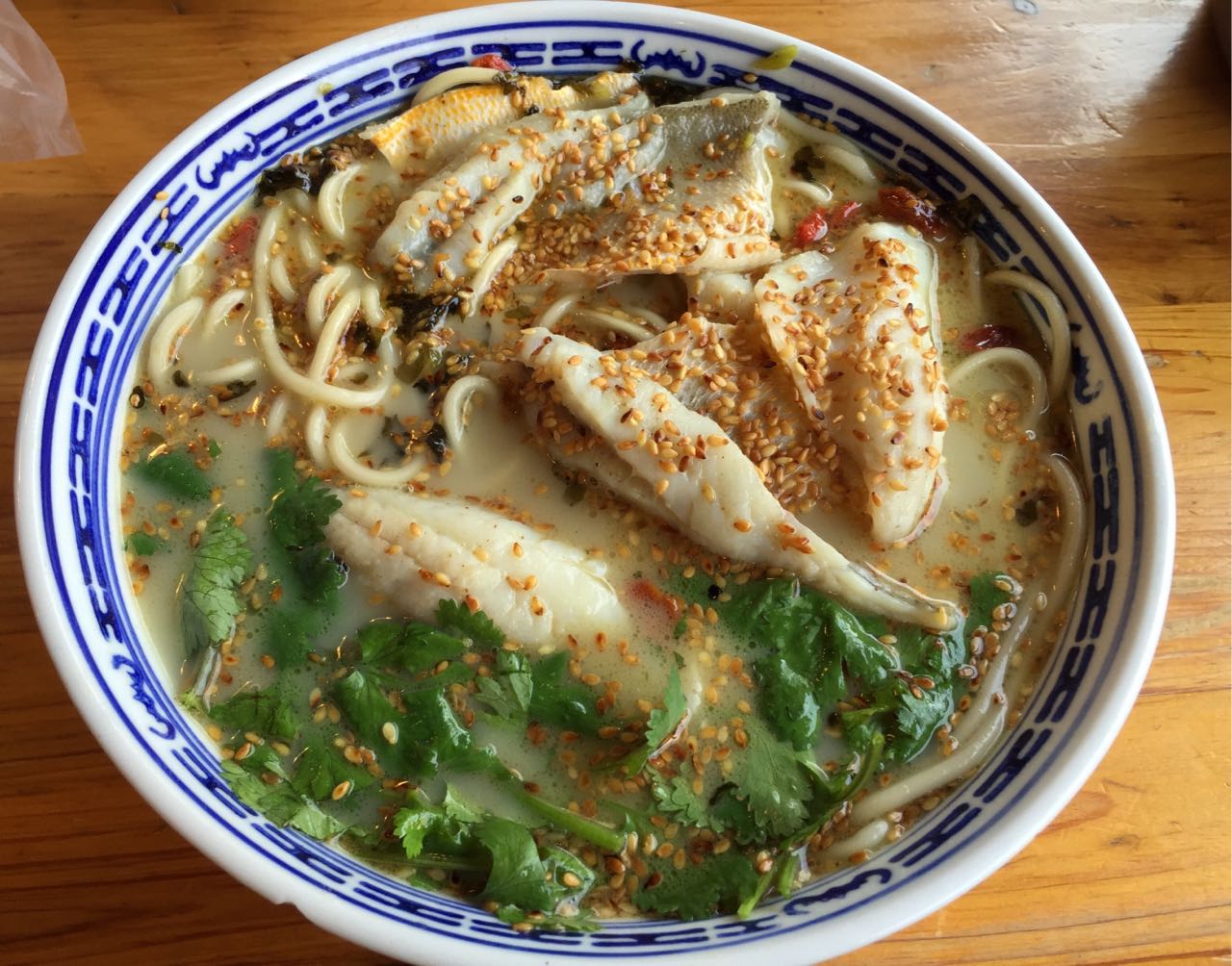 中午和同事们一起去用餐的 也算去拔草了 没想到中午客人那么多 买面 等位 上菜 一共30多分钟才吃到 一直纠结要点黄鱼面、牛蛙面都是招牌 小菜的炸猪排和猪手也都不错 只怪胃口太小 炸猪排蛮大块的 不算厚实 但不干柴 送了绿豆汤在夏日里还是很解暑的 黄鱼面上桌满满滴芝麻铺在面上 面条不算很粗口感不错 黄鱼就是鱼骨头多 肉质很嫩 下次应该回去尝试牛蛙面