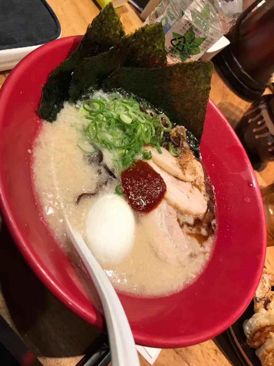 一家很火的面?一直是排队的状态。由于今天走太多了不想远走了就在附近觅食,于是来到一风堂,店不大位置不多,一直都是排队的状态,排队的时候先点餐然后等到你了就安排座位直接吃了,点了一个拉面饺子套餐一个拉面,感觉汤的味道不错,但是拉面细细的有点硬可能是不管日式拉面?感觉一般