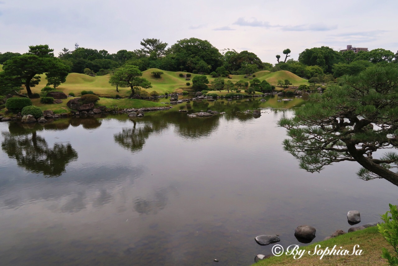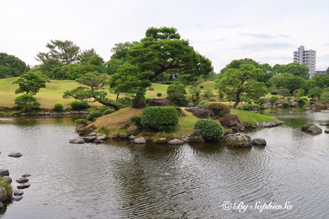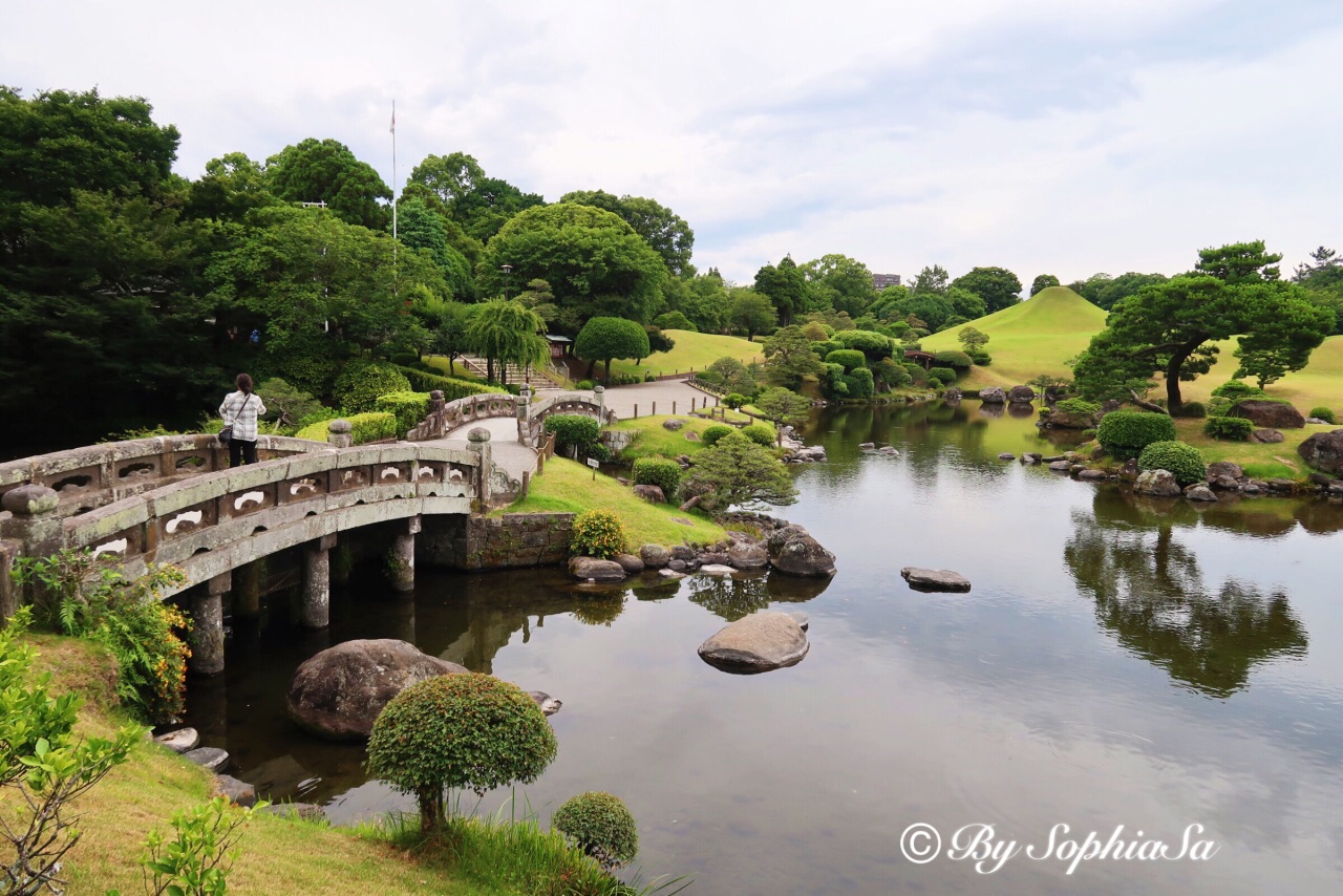 【水前寺成趣园】,自助买票,一人400日元。就是小小的日本园林,主要模仿东海道53景样式建成。和京都天龙寺比,面积有点小,景色有点逊色,还好人也很少,就当逛逛小公园。这个和伏见稻荷的红色千鸟居也是有山寨的感觉,还好,人真的很少,自己喜欢怎么摆拍就怎么摆拍吧。这里的出水神社里有眼泉水是为长寿之水,马上招呼爸妈过来洗手和喝两口,小小的成趣园最多半小时一定逛完。