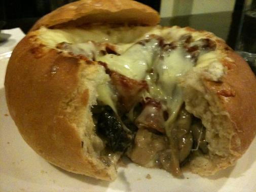 The Meatball--a delicious find! Steak, gravy, mushroom, onions, bacon and mozarella cheese in a round loaf. It's meant to be shared.