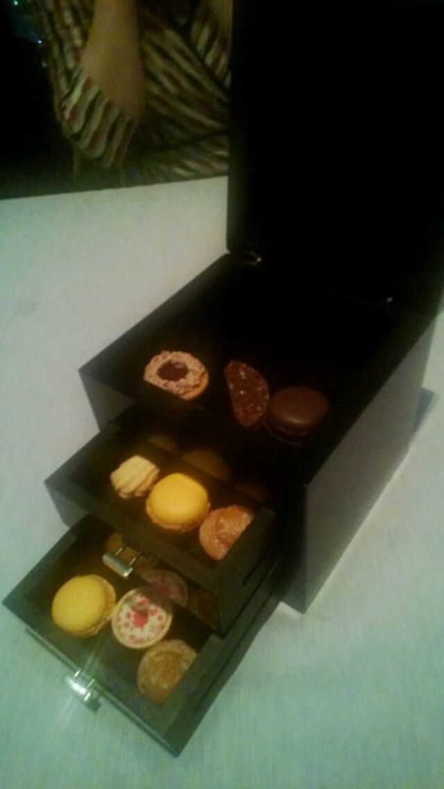 The petite fours. I'd say that the macarons are not as good as I had expected. A little too sweet and too crisp. The presentation's great though
