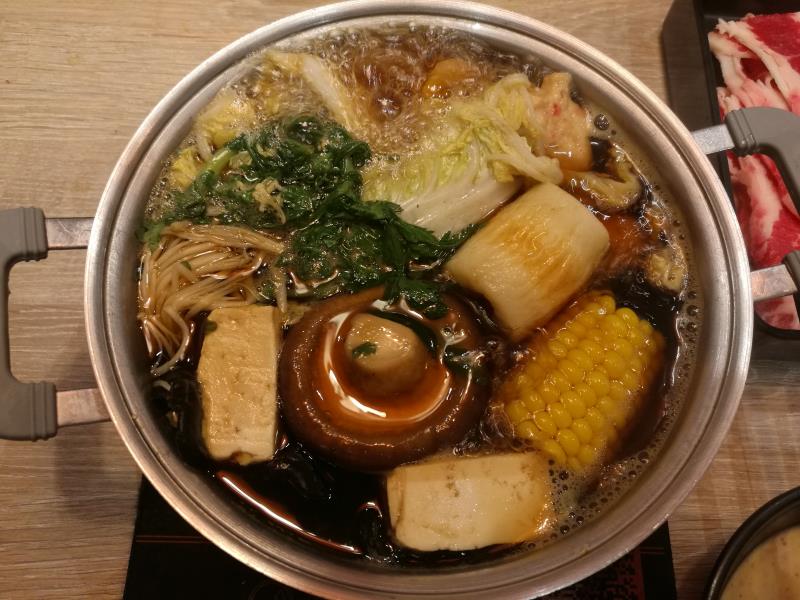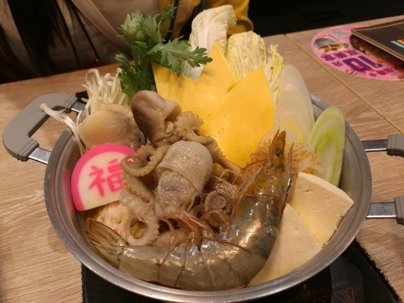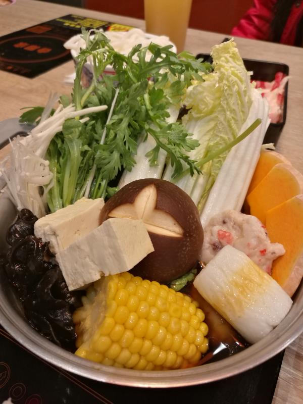 ...食材更丰富一些,除了蔬菜组合外,还有虾一只、墨斗鱼两只、贝壳数个,另有牛肉一盘,看起来非常丰富