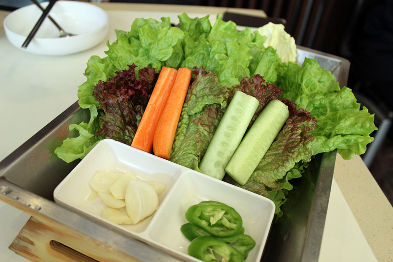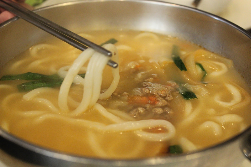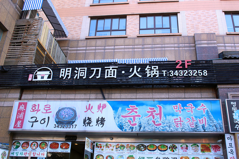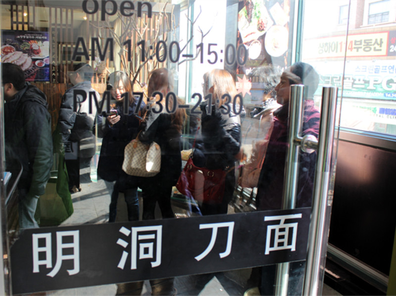 吃完烤肉,小伙伴又开始寻觅下一站,明洞刀面按偶偶的说法,要来总店吃,他自己也木吃过! 由于看错地址,导致我们一直在错误的地方瞎绕! 不过他家的牌子还真的不留心,不容易发现! 11:00-15:00 温馨提示:时间段以后只有饺子吃哦! 莫位妹子来此就是为了它! 继续排队,小伙伴们早已经习惯!等候时间不长,被安排了一个六人位,另外二位还在浮云中! 【餐前小菜】辣白菜,韩式餐馆必见的,口感一般! 【蔬菜】搭配肉肉吃的蔬菜,胡萝卜不错! 【明洞菜包肉】肉是放在水上蒸的,口感不错,好吃! 【双拼饺子】一笼6只,饺子感觉更像包子!辣白菜口味,口感更加开胃!白菜口味,就是木有放辣椒! 【刀面】第一口尝下汤,这味太熟悉了,多少次超市买了泡面回家泡开后的味道! 总结:值得一品的还是肉!