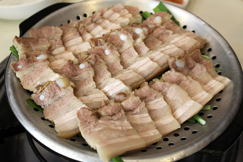 【明洞菜包肉】肉是放在水上蒸的,口感不错,好吃!辣白菜口味,口感更加开胃! 莫位妹子来此就是为了它
