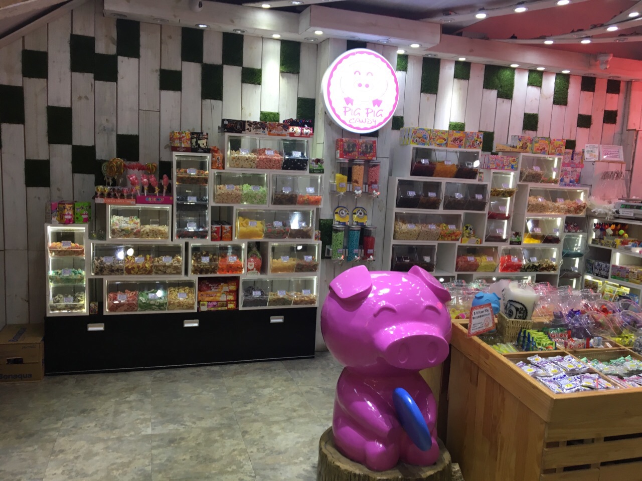 有不同的造型,也有不同的口味,很多的是那种含有非常多果胶含量的橡皮糖这家店的确是店如其名,pig就是猪猪嘛,这家店的门口就站着一只萌萌哒的粉红猪猪。店里的小格子里面,塞满了各种各样的彩虹糖果,五彩斑斓色彩缤纷。有不同的造型,也有不同的口味,很多的是那种含有非常多果胶含量的橡皮糖。