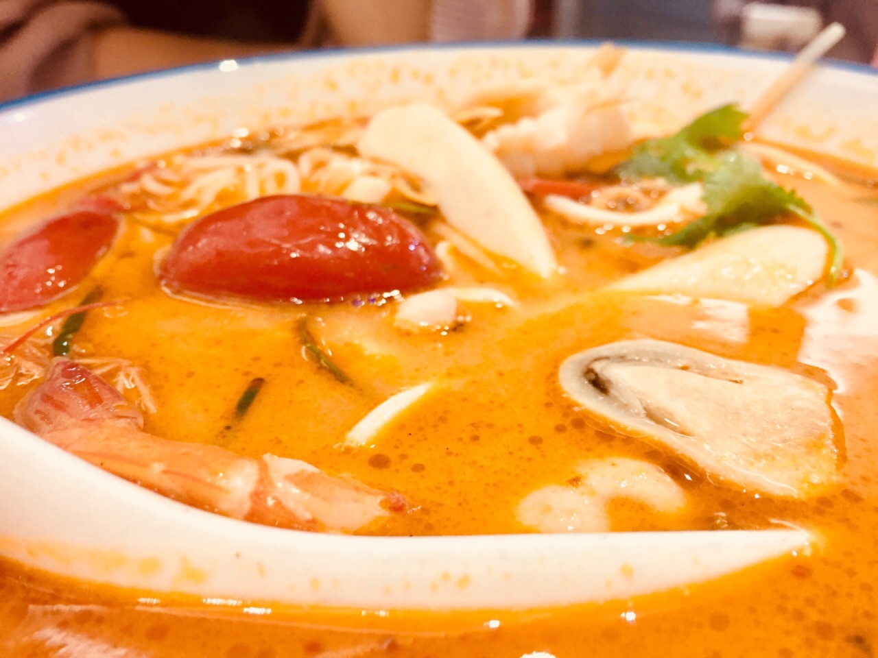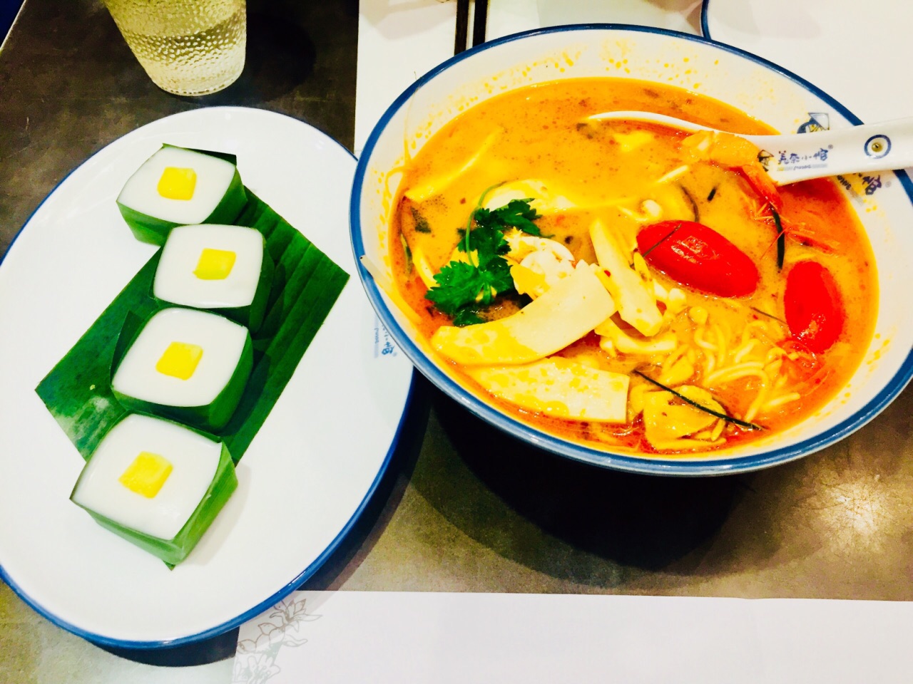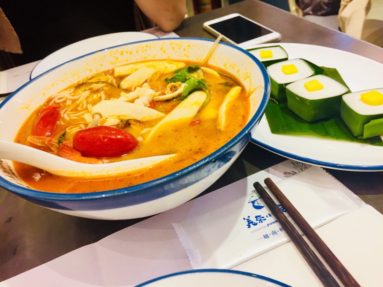 美奈小馆的越南菜深得我心这盘椰汁香兰西米糕浓浓的椰子味绝对可以俘获任何一位食客的心,软糯黏牙的西米糕搭配略酸的新鲜青芒果肉,真正的入口柔,椰子的香甜和芒果的酸味互相冲抵达到均衡状态,会有种平衡了口腔内PH值的舒适感,冰冰凉凉口感贼爽,适合在燥热的深圳为肠胃觅得一丝清凉。 不过我姐姐说这道菜本来应该是甜芒果的,这盘芒果夹生(´・_・`) 这盆冬阴功汤,两只青口两只虾,很多口蘑很多菇。冬阴功汤大概是我每吃东南亚菜必点的一道,泰国越南那边的菜系玩的就是酸和辣,刚开始觉得这盆汤既不够酸也不够辣,但是越吃越爽越兴奋,要的就是这个味道,唯一美中不足的是汤汁略清,不够浓稠,姐姐说去当地吃的冬阴功汤比这个汤汁要浓稠的多 芒果鱼柳米纸卷,这道被拔草的网红菜在网上点评被追捧的沸沸扬扬,里面有芒果鱼柳和一些蔬菜丝,同样是夹生略酸的芒果搭配炸过的鱼柳也不会太腻,加上蔬菜口味会变清淡,沾点醋汁味道会更鲜。