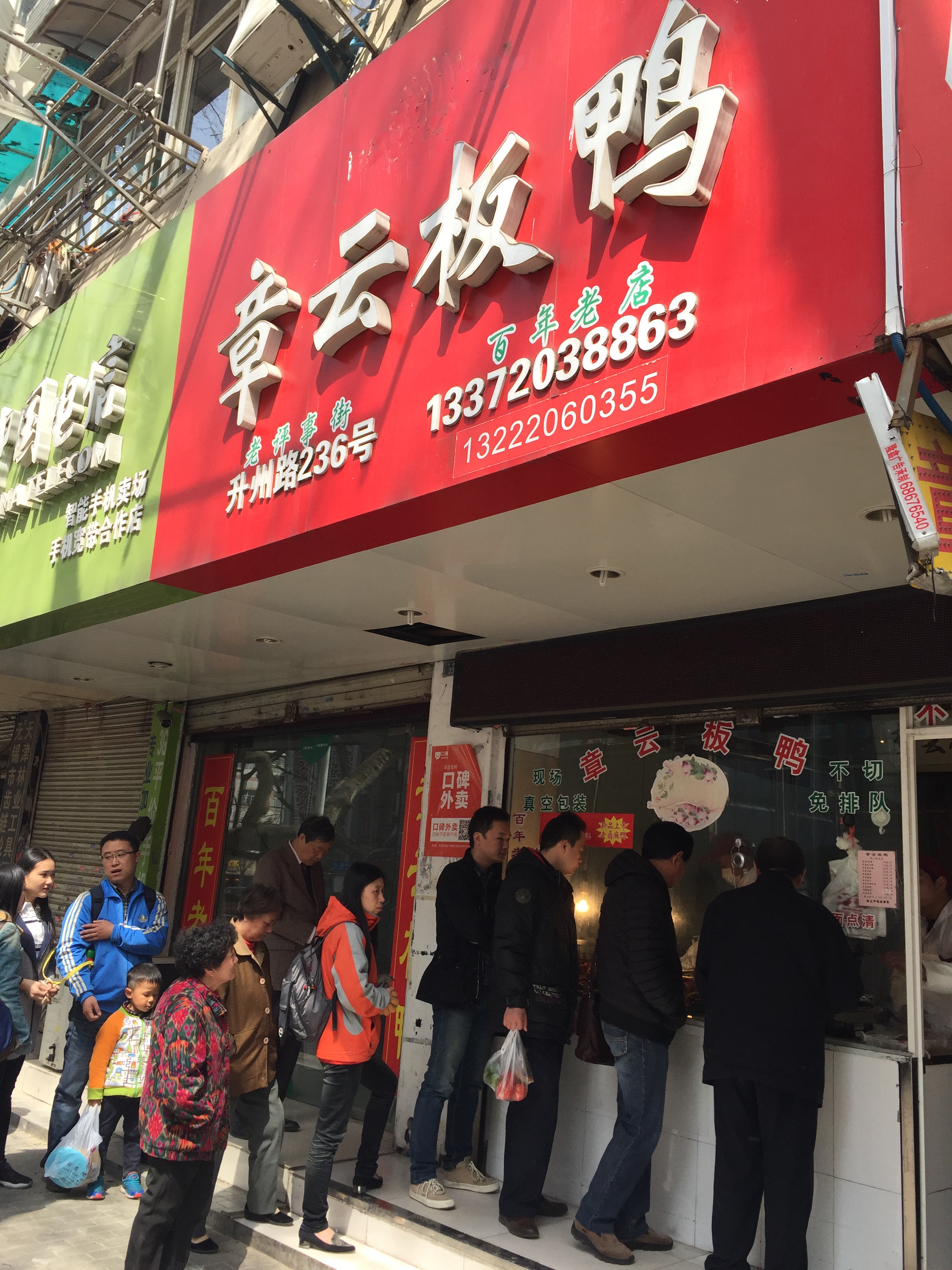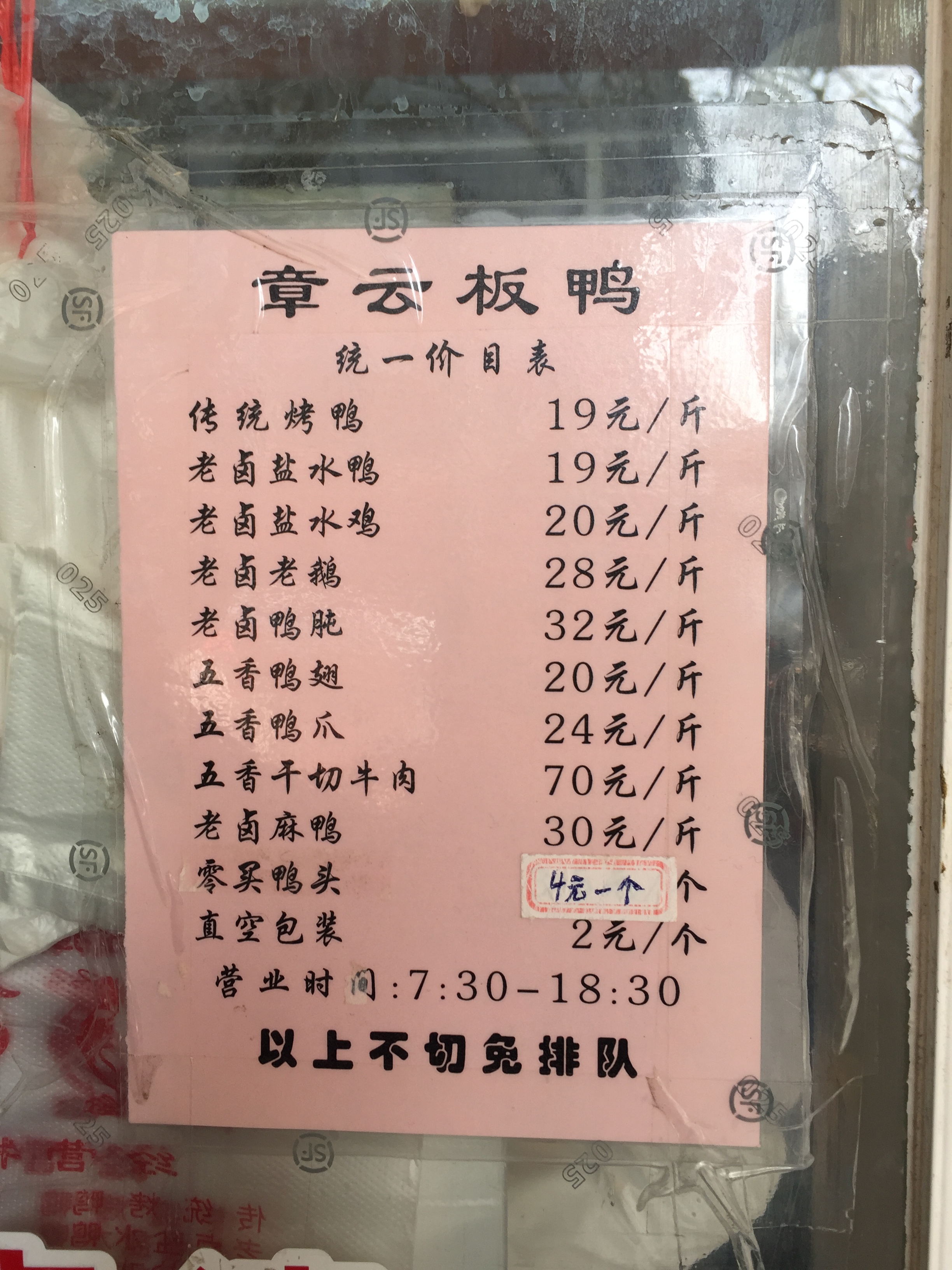 时隔5年再游南京 搜罗当地美食美景 章云板鸭 升州路上的百年老店 周末中午过去 就看到长长的队伍 只有一间房 一个小窗口 卖熟食的地儿 没有堂吃 贴了一张价目表 不切的可以免排队 真空包装2元一个 该店没有在网上销售或团购 谨防假冒受骗 老卤盐水鸭 19元/斤 买了一只论斤称 外加包装 一共59元 这是外带的 现场要了份传统烤鸭(鸭前脯)13元 送了老卤 看上去肉质鲜嫩 可惜皮厚且肥 所以称不上好吃 营业时间 上午7:30到晚上18:30