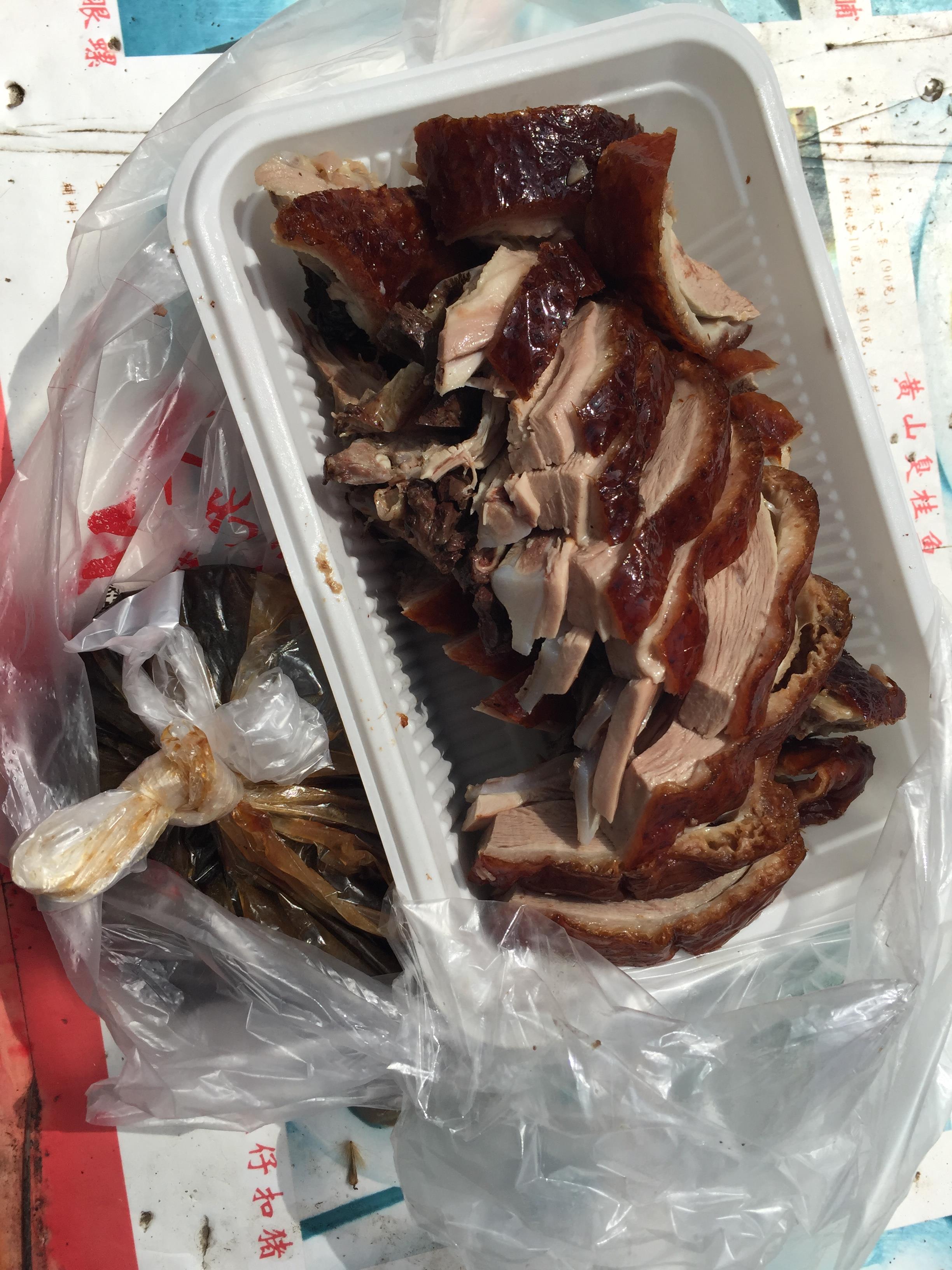 一共59元 这是外带的 现场要了份传统烤鸭。鸭前脯)13元 送了老卤 看上去肉质鲜嫩 可惜皮厚...