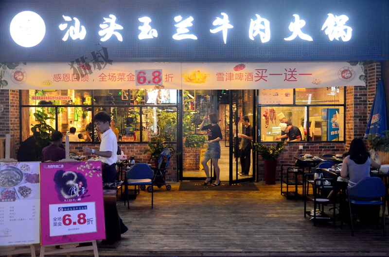 汕头玉兰牛肉火锅位于厦门东百蔡塘广场一楼外场,主营厦门这两年最流行最火爆的潮汕牛肉火锅,这种火锅的特点是牛肉新鲜现切,牛的各部位分门别类,口感味道各有妙处,涮烫7、8秒就可以吃了,口感娇嫩,能品尝到食材本身的原汁原味。 店内宽敞雅致,整洁清新,绿意盎然,有大大的包厢,还有露天的座位,用餐环境不错。厨师在透明的操作间熟练的切肉,新鲜看的见。 调料是自助的,配料品种挺多,可以根据个人口味自行调制。 开始涮肉,玉兰有个很有特色的牛型盘子套餐,牛的各部位的肉肉盛放在牛型盘的相应位置,这下终于可以弄清牛的各部位的肉叫什么名字啦! 也有单独装盘的肉,品尝了牛筋丸、嫩肉、吊龙、匙仁、肥牛肉、胸口朥,还有牛筋、牛鞭、牛肠,虽然口感味道各不相同,但都很好吃,每种都加点了几盘,大快朵颐。 肉肉虽好,但是蔬菜也是必不可少的,营养均衡去油解腻,玉兰的蔬菜品种丰富,新鲜水灵,还有鸡枞菌这种平时比较少见的款式,蔬菜在香浓的牛肉汤中涮烫,清爽而不清淡,吃起来有滋有味,完全不比牛肉逊色。 喜欢吃主食的话可以来份牛肉水饺,个头硕大,皮薄馅美,很快就被瓜分一空。 吃饱喝足,旁边的广场上刚好有庆祝国庆的文艺演出,看完演出尽兴而归,不虚此行。