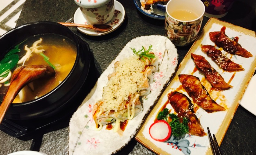 和室友一起去的,上来一道吃一道,基本等上完了我们就都吃完了233333脱了鞋子坐的榻榻米(。)餐具都敲可爱*^o^*味道也不错的,并且也吃的很饱,怕上得慢就先点了两份单人寿司套餐吃着,比较喜欢三文鱼和大阪烧,金枪鱼沙拉也很入味,甜虾棒棒哒,乌冬面超大份而且非常Q软嘤嘤嘤,服务生态度还好,就是有点懵不是特别懂日料的样子。