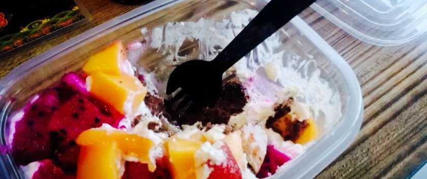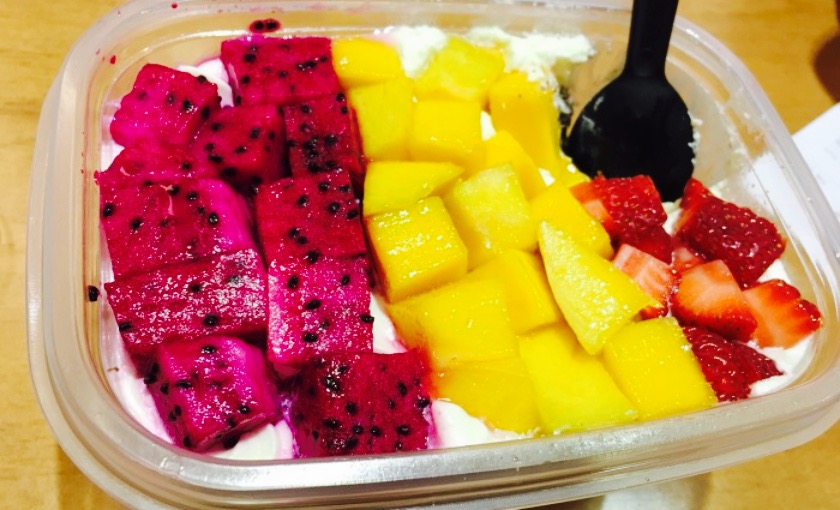 奶油相当不错,搭配巧克力蛋糕胚,还有新鲜的甜心火龙果,想说还是蛮好吃哒,败笔罐头黄桃,有点拉低...