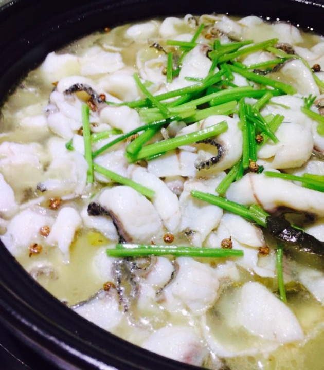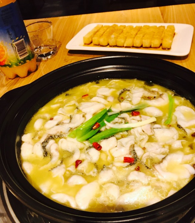 学妹请客吃饭,趁机来拔草,每次路过这里都没进去过,不是周末居然生意也能如此好,并且是女性食客居多哦。入店后服务员很热心,接待了免费的菊花茶和银耳枸杞糖水,清火的很合适搭配鱼火锅哟。挑了条三斤出头的黑鱼,做微辣的口味,等鱼的时候点的冷菜上的很快,厥根粉和拍黄瓜,口味一般没有出色的地方。没多久一锅鱼就来了,说实话比九味的快太多了。九味的一条鱼竟然要一个多小时。鱼片片的很薄,沾粉不多,但是很嫩,配菜是酸菜酸萝卜片和粉条,微辣的辣度正好,本人觉得口感比九味好,一锅满满当当压根吃不完,剩下一半就打包了。两个人消费185,整体性价比很高,更适合3个人以上来吃,下次部门聚餐再来了。