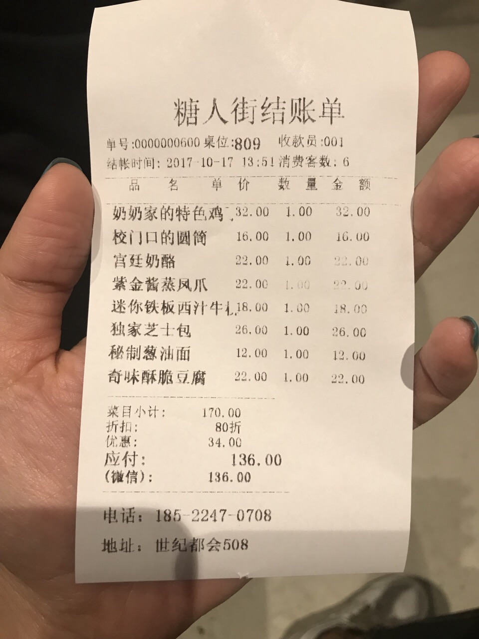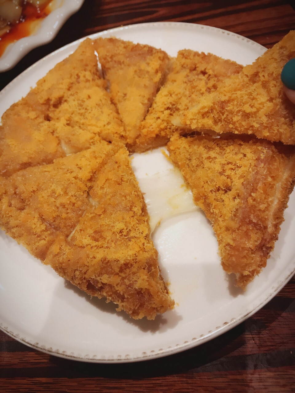 新开的一家80后怀旧主题餐厅“糖人街”装修极具特色,店内循环播放小时候的流行歌曲,一不小心好多人暴露了年龄!哈哈! 中午去的,贴心的老板在门口放了隔离带禁止入内了,询问后得知,由于中午人多,上菜较慢,老板怕客人有的下午着急上班,于是控制了一下! 菜品有有小时候的味道…… 芝士包,外皮金黄酥脆,有肉松,里面超多拔丝芝士夹杂着红豆,很香甜! 迷你铁板西汁牛柳,盘子上来一看是挺迷你,不过毕竟价格才18元,个人觉得略甜,几个人一人吃点正好! 校门口的圆筒,小时候味道,16元4个,没吃到冰渣渣的感觉,没有大红桥某小学门口的那么酸。(我小时候没吃过几次这个,后来爱吃酸的,才觉得记忆里是有这个味道的) 宫廷奶酪,这个强烈推荐,桌桌必点啊,端上桌貌似葫芦娃出山了,有仙气,(你们点了就知道了)口感滑嫩,奶香四溢,好似在吃冰淇凌。 紫金酱蒸凤爪,不敢吃,怕鸡爪子挠我,据说不错,我吃了里面的果仁! 葱油面,点了一碗,后悔了,点少了!!!三个人抢一碗面!因为我们都爱吃! 奶奶家的特色鸡丁,宫保鸡丁甜口的,超大块鸡腿肉,吃一块过瘾!亲奶奶才会这么做吧! 奇味酥脆豆腐,奇味啊,好奇特,说了没意义了,请自行品尝!