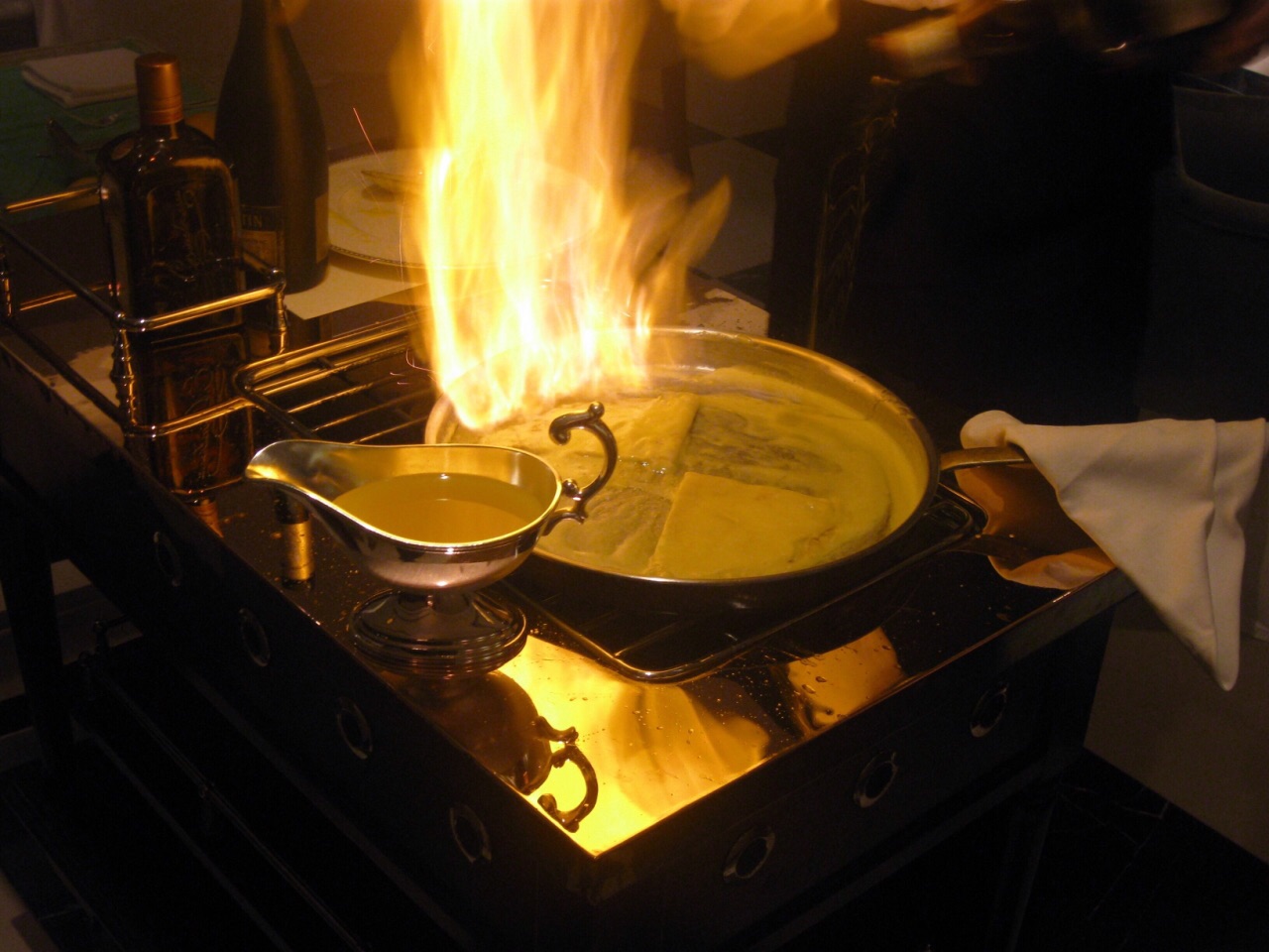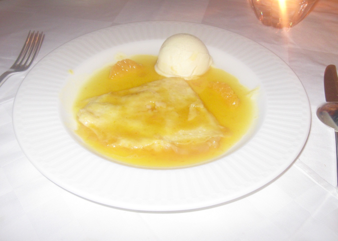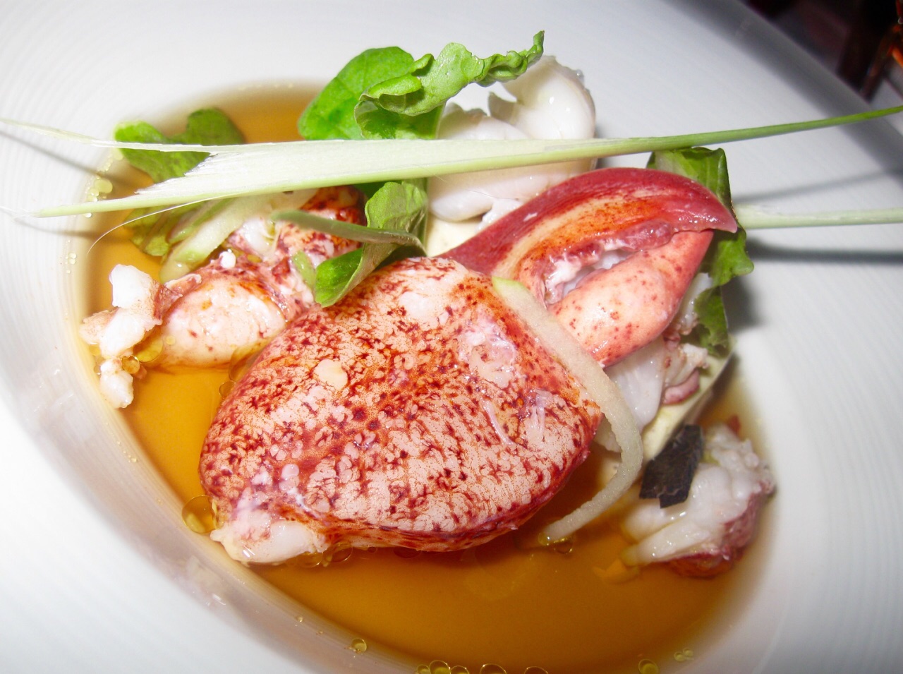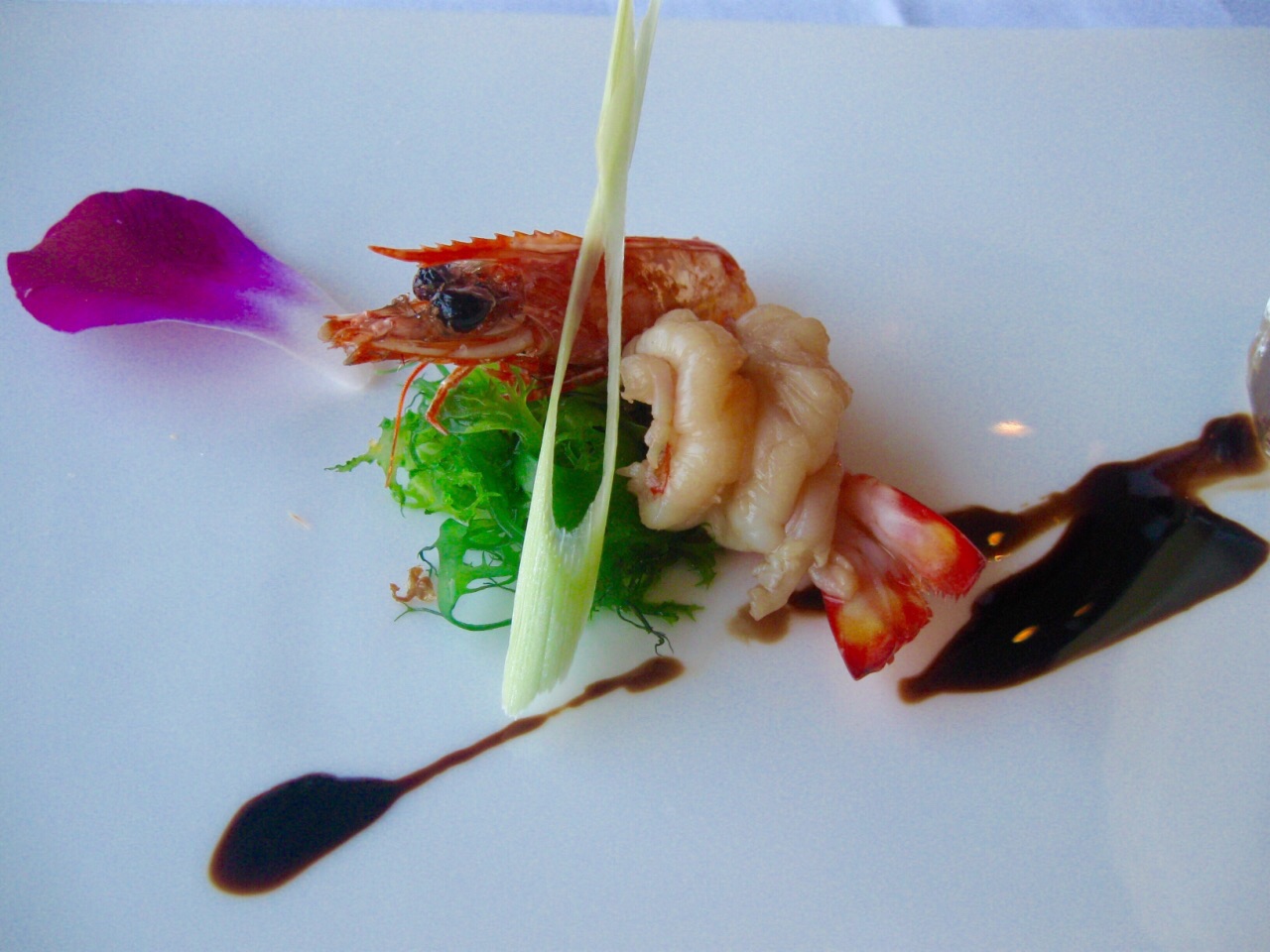 走进欧陆餐厅,一切都变得那么的奢华,随着花园饭店直达33楼观光电梯的上升,我的视野也从仰视--俯视,而后变得忽然开朗。我特别预定了靠窗的位置。美好的夜晚由此开始。 开胃菜 竹节虾+胡罗卜奶油汤+牛肉清汤鱼子冻,摆盘很漂亮。 其中的牛肉清汤鱼子冻很有特色,在一个被掏空的樱桃小番茄里,很漂亮,胡萝卜丝围边,中间点缀着一堆鱼子,盘中星星点点的洒着黑色的陈年老醋,若怕腥可以沾点。 前菜 嫩煎鹅肝配大蒜烩白豆,鹅肝肥腴,外皮煎得很脆,里面嫩是嫩得来,入口即化。底下配红酒沙司,和有大蒜味道的白豆,上面配的炸过的胡萝卜丝,吃起来松脆脆的,和炸土豆丝也差不多。 牛肉清汤 真是很见功力,琥珀色清澈见底,除了底下躺着法国人为之迷恋的梦幻食材--松露,没有一朵油花,呵呵,百闻不如一见,经典啊,如此精心烹饪的美味无须更多,足以满足挑剔的口味,牛肉和松露的鲜味融合起来,鲜掉眉毛! 海鲜 龙虾炖蛋配牛肉清汤 这龙虾的质量就是不一样,相当新鲜,肉质紧实弹牙,味鲜甜可口,钳子肉大而结实,嚼起来很过瘾,我最喜欢的,呵呵。钳子下躺着的是龙虾汁炖蛋,嫩嫩的异常鲜美,充盈着浓郁的龙虾鲜味。上面漂着的二根是柠檬草叶,咬一口,满口清香。 冰霜 香馨水果风味冰霜 小粒状的啫哩冰霜是柚子味的,酸甜中有点微苦,入口清新,上面铺着切成小丁的西瓜、猕猴桃、橙子、火龙果等,色彩晶莹缤纷。 主食 大连和牛沙朗 哈哈,这是我的最爱,骨头边上的肉肉才是最好吃的,和牛与欧洲、澳洲牛种相比,其肉做成的牛排特别有馥郁的口感,那种鲜美程度是一般牛排不能比拟的,纯正的原料,采用比较清淡的烹调,保留了其原有的风味,配以他们的招牌酱料红酒小洋葱沙司,逼出了牛肉的鲜味,融合成香气袭人的味道,鲜香精致,美味可口。 色拉 配牛排的蔬菜沙拉,是用醋和橄榄油拌的。 甜点 火烧橙味法式薄饼配香草冰淇淋,这是我特点的,老噱头额,服务员在你面前当场制作,用了3种洋酒、一个橙、一大份调和了陈皮和柠檬的黄油,适量橙汁、柠檬来烹制那个法式饼,在烧那个橙时让橙汁滴进盘中,这整个的制作过程很养眼,浸满奶香味的橙味薄饼,略带鲜橙的酸甜、柠檬的香气,滋味实在美妙,透着淡淡的酒精味,配合冰淇淋的爽滑,冰火交融,在舌尖翩翩起舞。太享受了! 咖啡和配的小点心也很不错:杏仁薄片、巧克力味很浓的巧克力奶油蛋糕、果味夹心蛋糕。