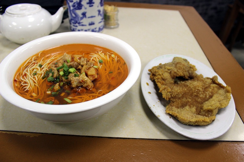 以前的品芳面馆,重新装修以后摇身一变“春园” 缘由不得而知,只知道点评上的地址已经是“春园” 距离公司也不远,找机会就去一次,晚上下着雨,想吃辣肉面和炸猪排,春园之前路过就打探过了,二样都有! 坐车2站,步行20分钟,选择后者,原因可以节省2元钱呢! 熟门熟路,到店没啥顾客,双休日的缘故或者是下雨的缘故吧! 【笋丁辣肉面】加了笋丁提升了辣肉的口感,微辣肉香,面条还可以在硬一些! 【炸猪排】猪排不小,但外面裹得面粉炸后太硬!