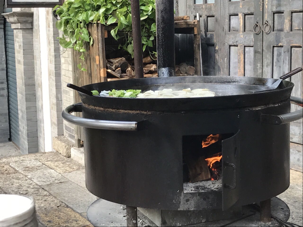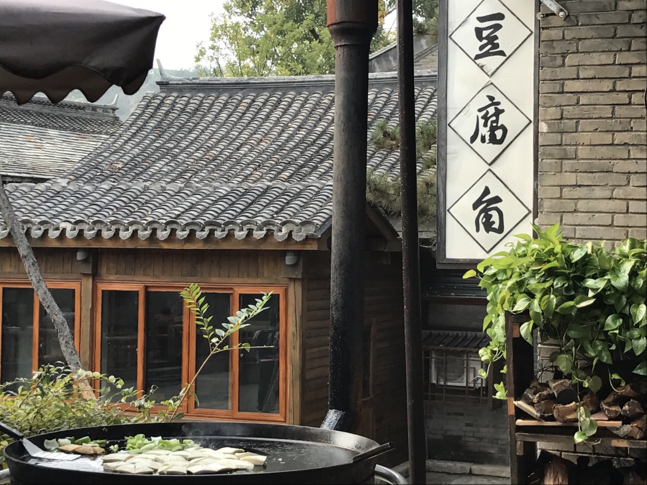走到跟前的时候刚刚好卖完一批,所以在等待的时候我就目睹了它出锅的全部过程。 这是真的一个大柴火锅,我看着师傅不停地往里填柴。火苗儿蹿着,大平锅里铺了切好的豆腐角,还有青椒,大概五分钟,豆腐片儿在油里慢慢就由白变黄,稍微皱了皮儿,再翻面儿煎几分钟,出来淋了调料,热气腾腾就可以吃啦! 好吃,应该说是在古北水镇所有小吃里和桥头糕并列第一 扫码付费,干净,省时。