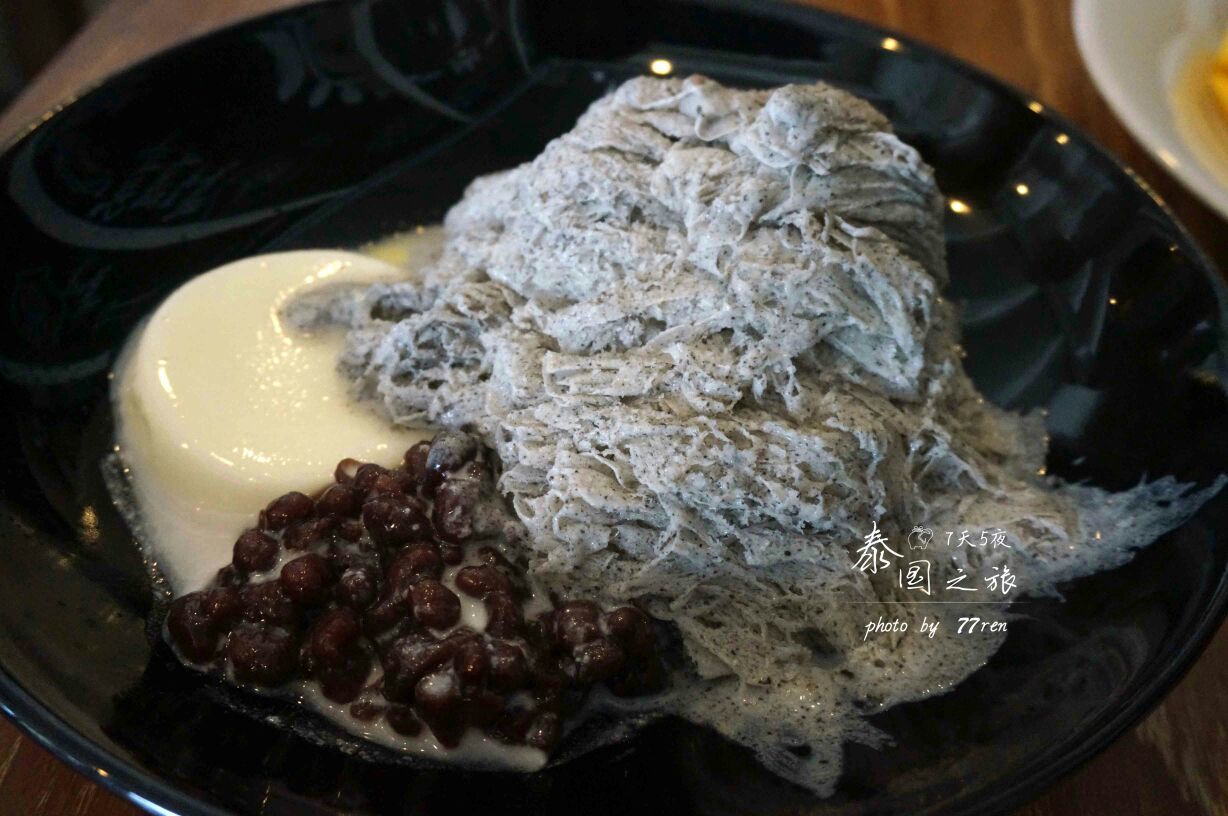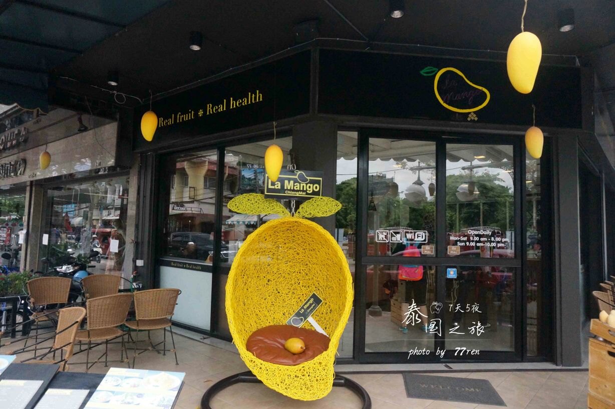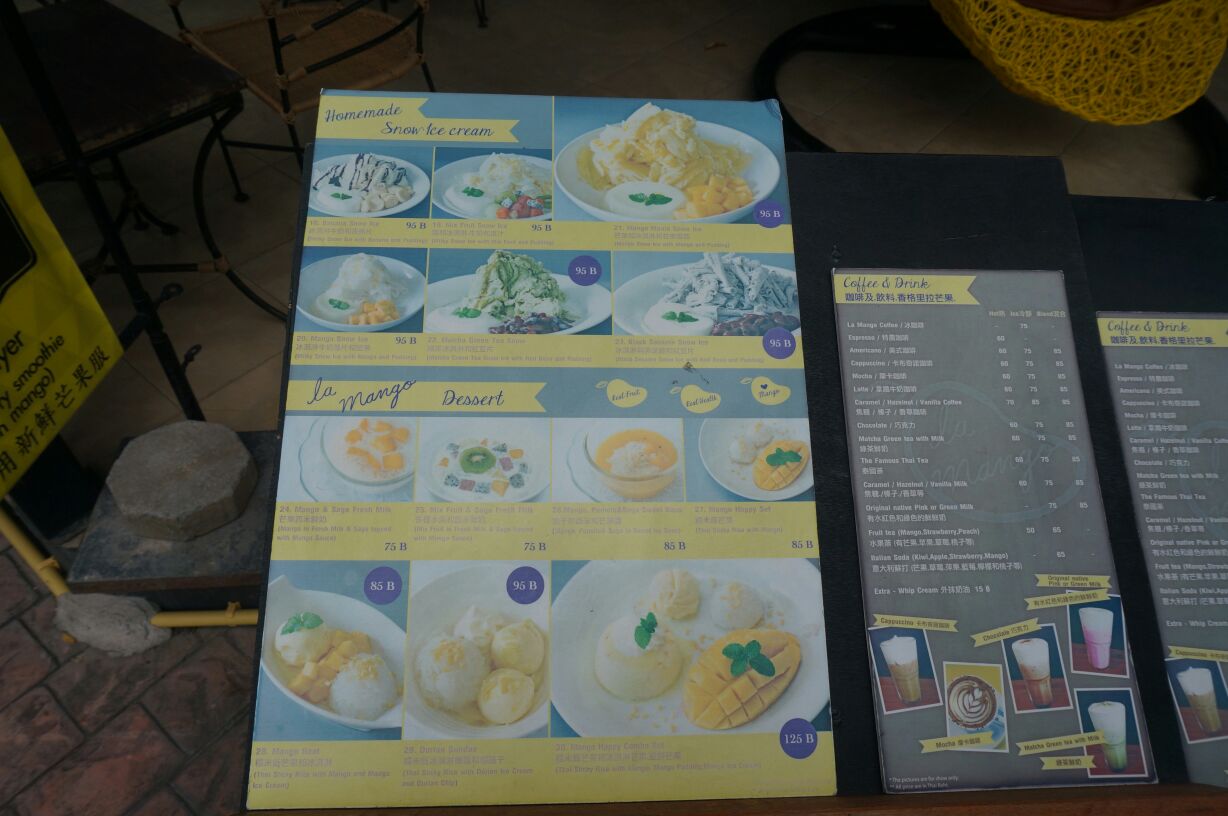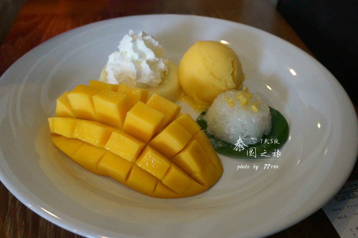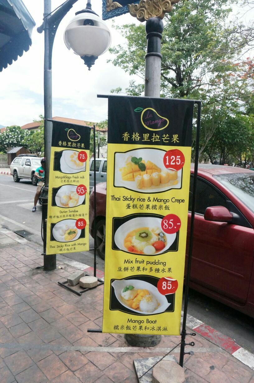在清迈的最后一天就是在古城漫无目的的闲逛,之前吃好了发清海南鸡饭,就找甜品店了。 这家门口有一个很显眼的芒果形状椅子,小伙伴在拍过照片以后,就饶有兴趣的想吃这家看看。 芒果糯米饭 125株 貌似来泰国吃了N家的芒果糯米饭了,像是找了魔一样,每一家的芒果都超级新鲜好味的。 区别就是糯米饭和椰浆了,她们是家甜品店,所以糯米饭就一小坨,还配了冰淇淋和奶油。 黑芝麻雪花冰 95株 这个是符合77口味的甜品,因为不会很甜,哈哈!红豆和布丁也很好吃噢。 冰绿茶 75株 之前在K2喝了一杯超级满意的,这家的口味对我而言还是甜腻了些。 摩卡咖啡 75株 算不上是特色产品吧,就是小伙伴不能喝冰的而点的。