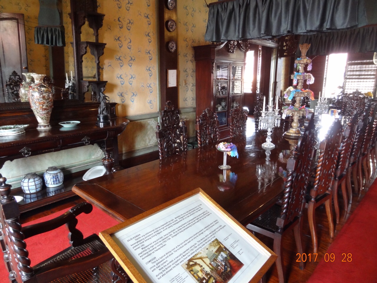 在圣奥古斯丁教堂附近,偶然发现的小众博物馆。博物馆比较隐秘,街边只有一个门洞,穿过一个精致的小门,有个有喷泉的院落,四周的建筑把这个喷泉小院围城一个天井,有点儿四合院的味道。院子一觉的小屋里买票,参观这个马尼拉很久一起富裕人家的宅子。 宅子里面多是深色油漆的木制家具。和现代家庭一样,大房子有客厅,起居室,餐厅,书房,会客厅,厨房,卫生间。这些房子都是围绕着小院子的三层楼中分布。家具装修很精致,特别是二楼的会客厅,房间很大很通透,阳光很足,通风很好。半透的隔断和门,又可以隔断不同空间,果然是大户人家。参观是单行的,沿着红地毯走,可不开闪光灯照相,除了正堂的宅子主人的画像之外,都可以拍照,每个房间都有保安,很负责任的保护陈设不被游人触碰。游览的最后,会从三层的外楼梯走下到喷泉小院中。很惊讶这个外表不起眼但别有洞天的博物馆。