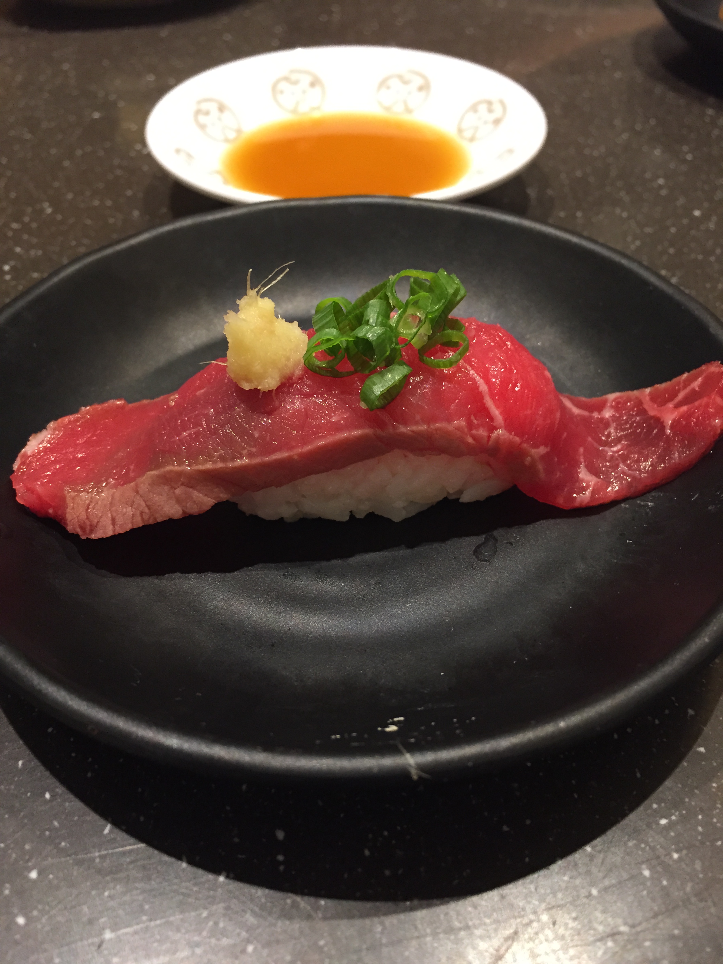 肉质不喜欢 『他他牛』¥10 新品 有搭配调料 一整片鲜嫩牛肉刺身盖在寿司上 以姜葱点缀 吃口...