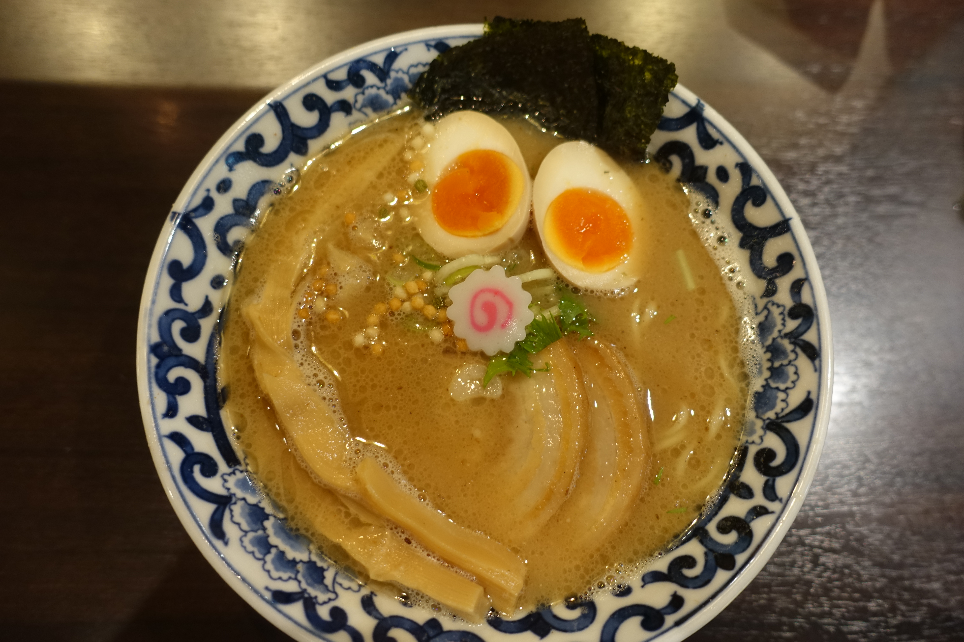 在东京站八重洲一侧地下一层南端,和六厘舍靠的很近。六厘舍排队有点长,所以来试试这家。也许是期望比较高,所以尝了以后有些失望。面汤口味偏咸,还有一种不太容易接受的鲜腥口味。温泉蛋马马虎虎,配的肉片和笋条质量还行。相比较而言,一兰和一风堂更清淡一些老少咸宜,斑鸠适合口味比较重的食客。