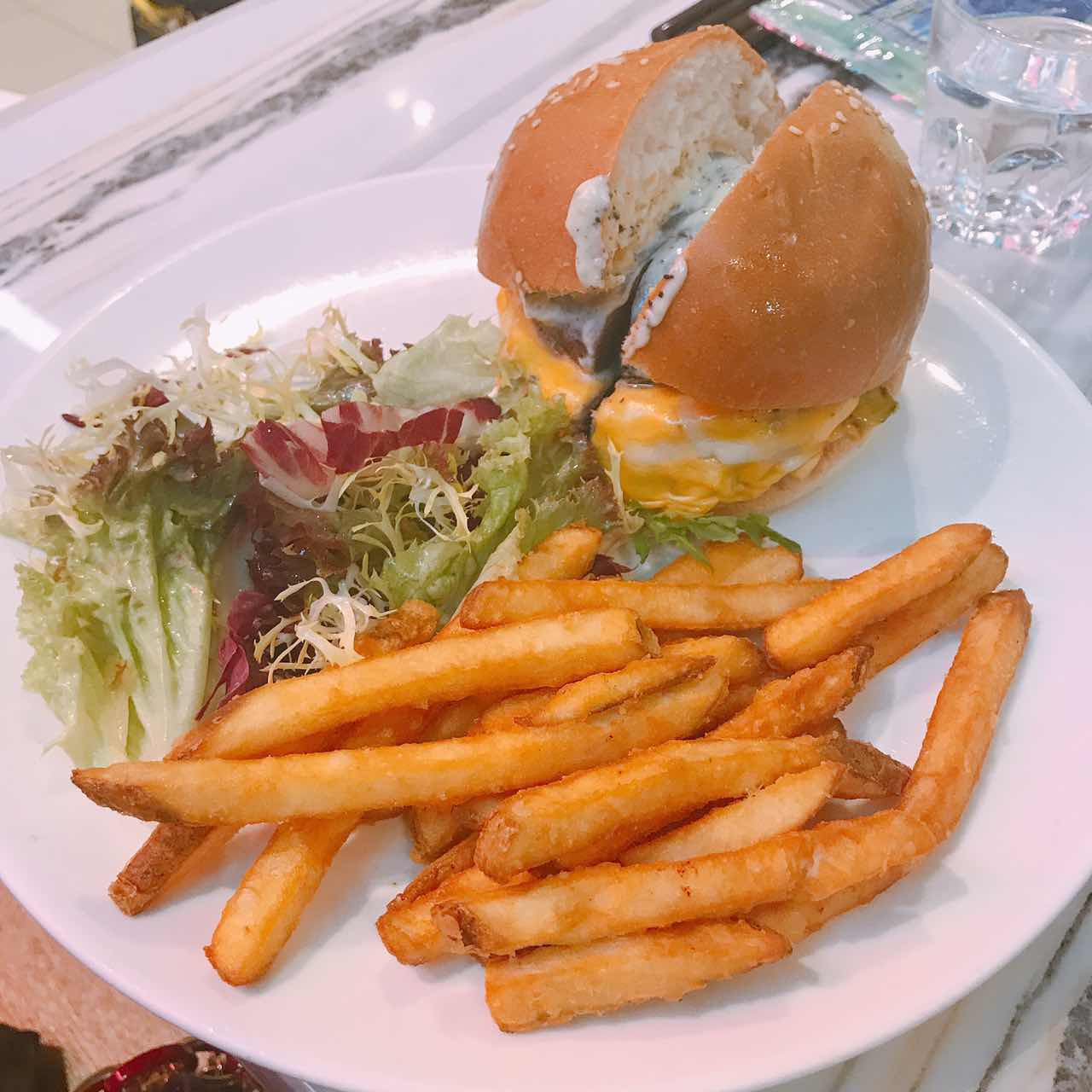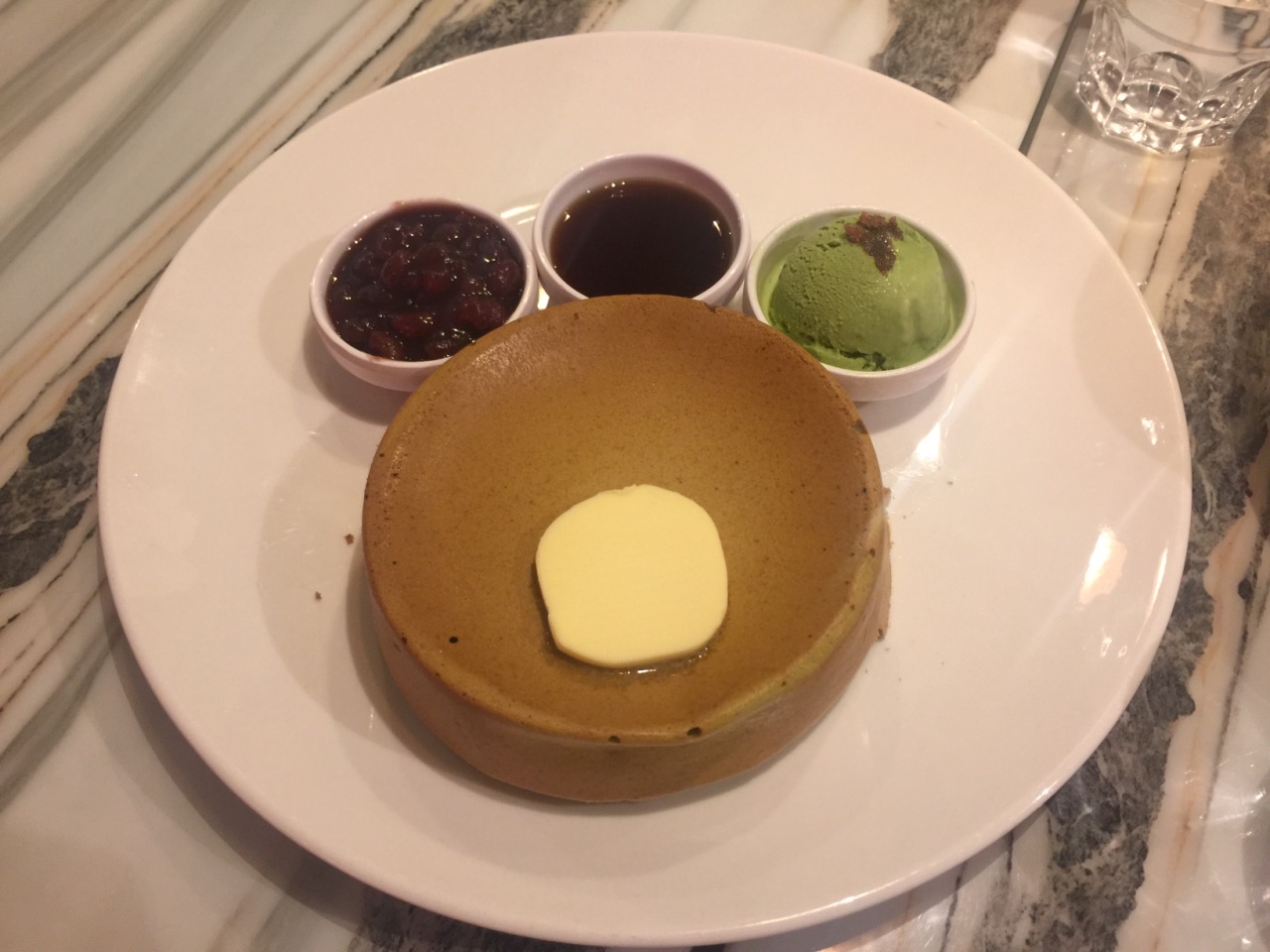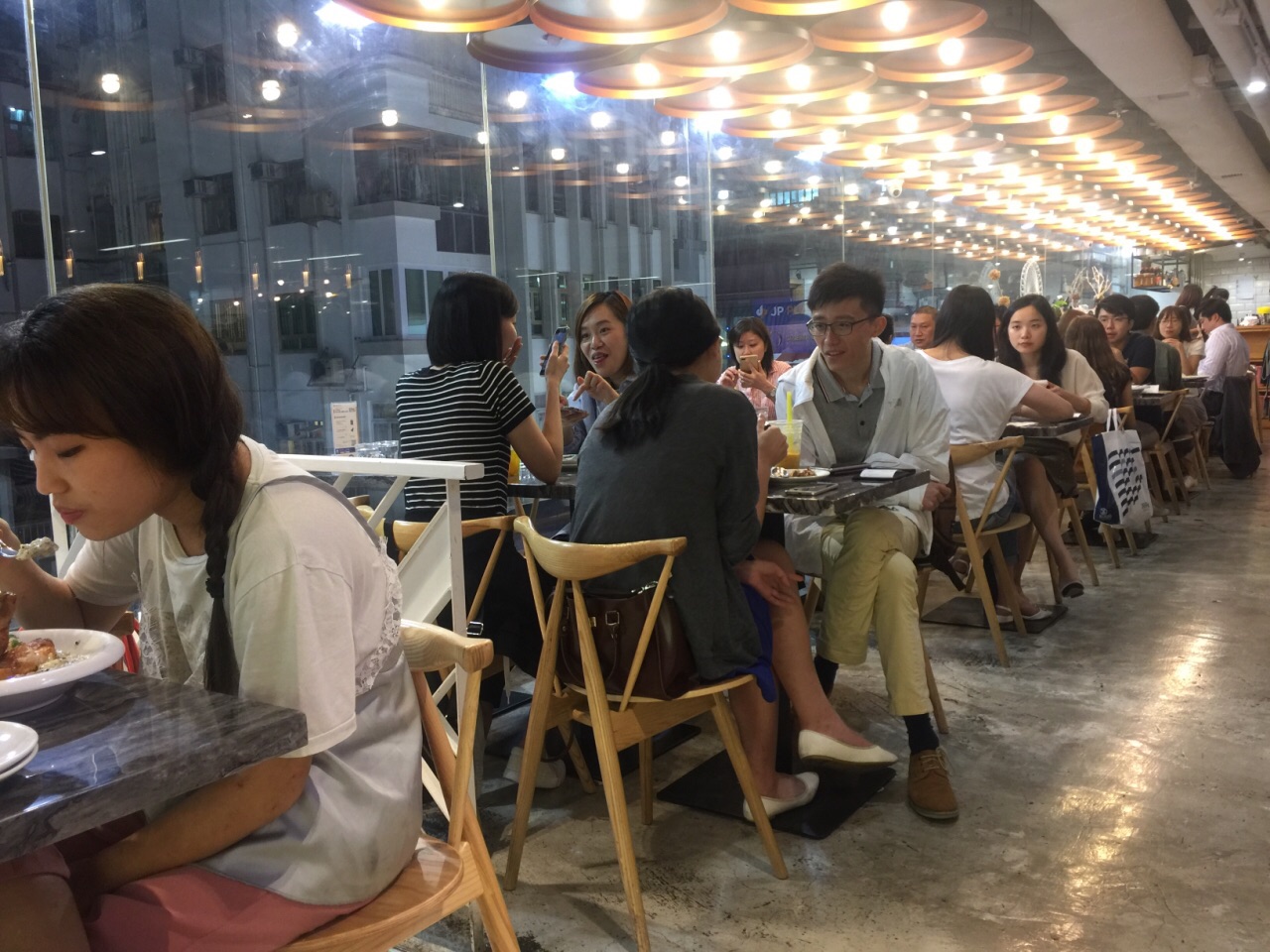 一家主打甜品的小西餐厅,主食仅有简单的几款意大利面、意大利烩饭以及全日早餐,墨鱼汁意面做得不错,加了蒜片去腥,墨汁浓郁,烩饭黑松露下得不少,黑松露和芝士结合,味道很香,但是比较咸。甜品款式较多,而且做得很出色,抹茶红豆松饼搭配抹茶蛋糕,非常好吃,一点也不腻。另外还有炸薯条、炸鸡翅等小吃可选,厚薯条分量很大,还配有三款酱汁可蘸,这点很好。 这家店只能用现金,这点很不先进!环境不错,可选窗边座位,下面就是熙熙攘攘的铜锣湾。