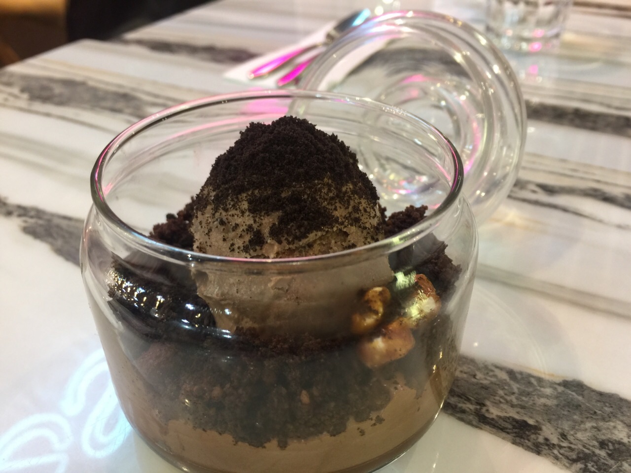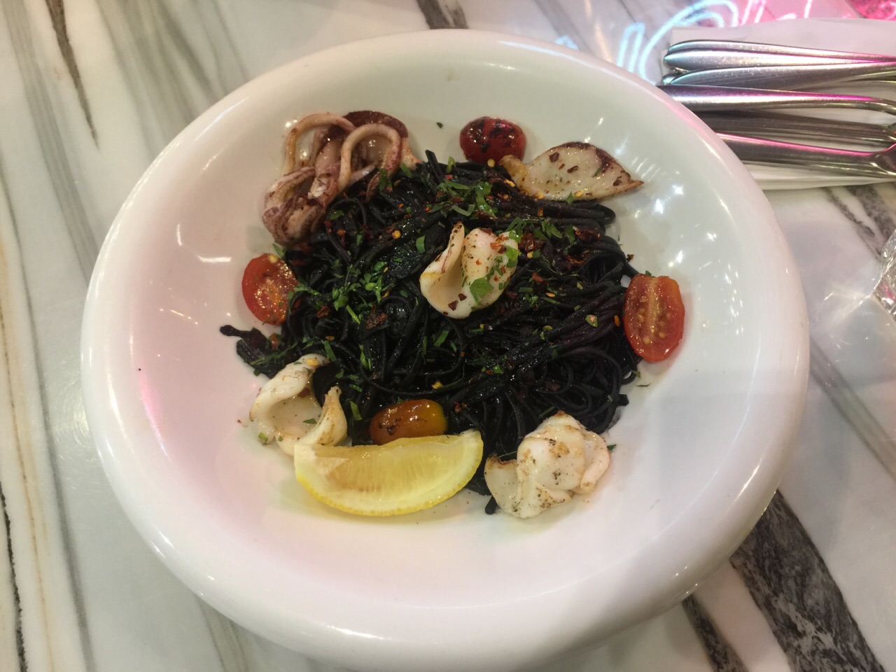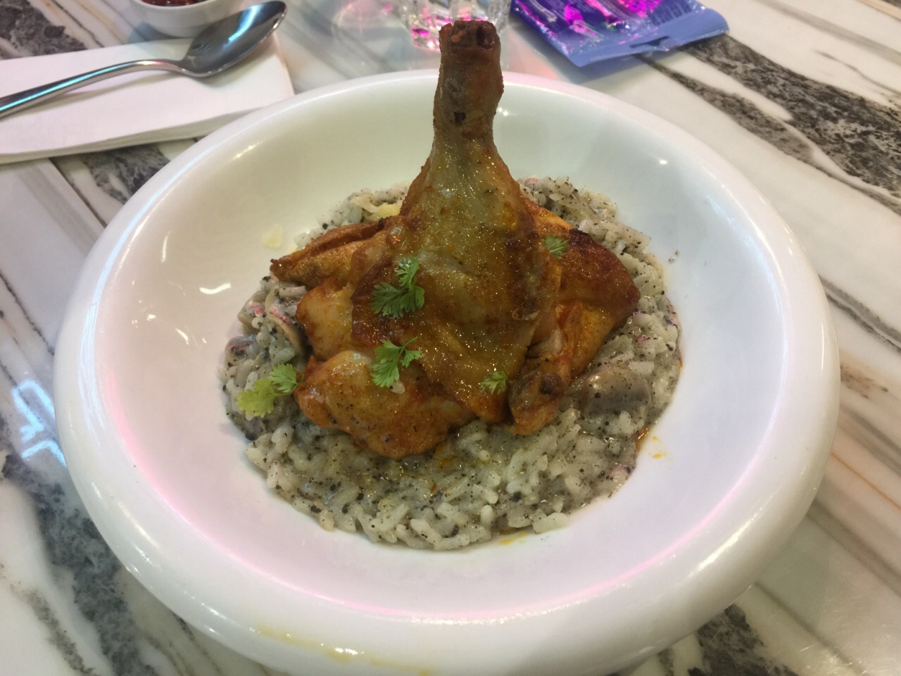 一家主打甜品的小西餐厅,主食仅有简单的几款意大利面、意大利烩饭以及全日早餐,墨鱼汁意面做得不错,加了蒜片去腥,墨汁浓郁,烩饭黑松露下得不少,黑松露和芝士结合,味道很香,但是比较咸。甜品款式较多,而且做得很出色,抹茶红豆松饼搭配抹茶蛋糕,非常好吃,一点也不腻。另外还有炸薯条、炸鸡翅等小吃可选,厚薯条分量很大,还配有三款酱汁可蘸,这点很好。 这家店只能用现金,这点很不先进!环境不错,可选窗边座位,下面就是熙熙攘攘的铜锣湾。